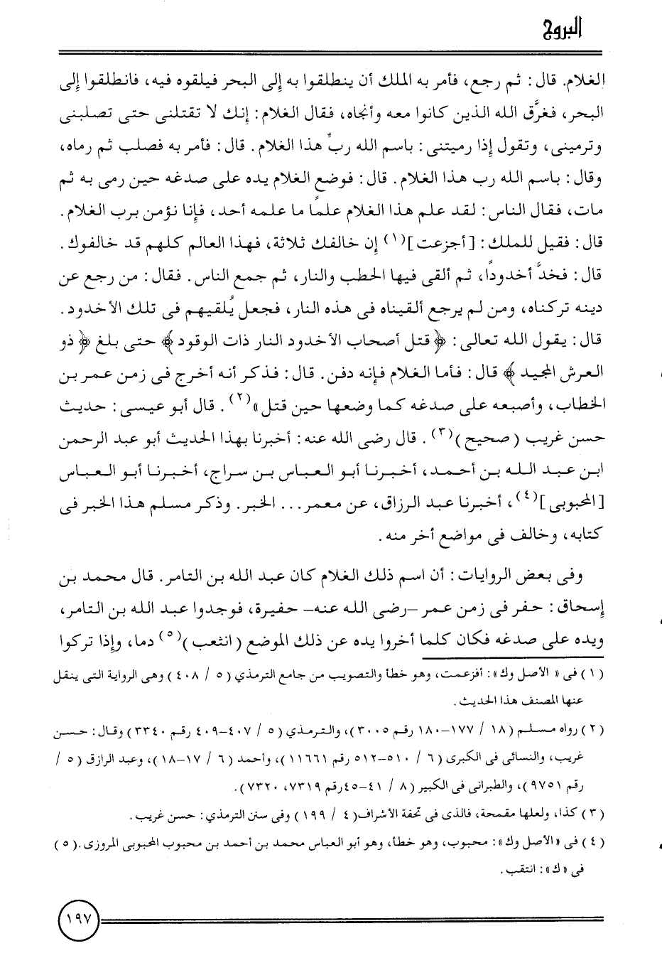 قَالَ: ثمَّ رَجَعَ، فَأمر بِهِ الْملك أَن ينطلقوا بِهِ إِلَى الْبَحْر فَيُلْقُوهُ فِيهِ، فَانْطَلقُوا إِلَى الْبَحْر، فغرق الله الَّذين كَانُوا مَعَه وأنجاه، فَقَالَ الْغُلَام: إِنَّك لَا تقتلني حَتَّى تصلبني وترميني، وَتقول إِذا رميتني: باسم الله رب هَذَا الْغُلَام.