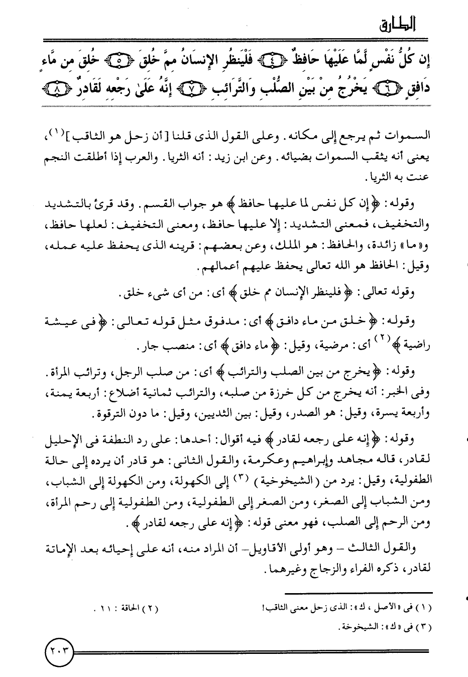 {إِن كل نفس لما عَلَيْهَا حَافظ (4) فَلْينْظر الْإِنْسَان مِم خلق (5) خلق من مَاء دافق (6) يخرج من بَين الصلب والترائب (7) إِنَّه على رجعه لقادر (8) } . السَّمَوَات ثمَّ يرجع إِلَى مَكَانَهُ.