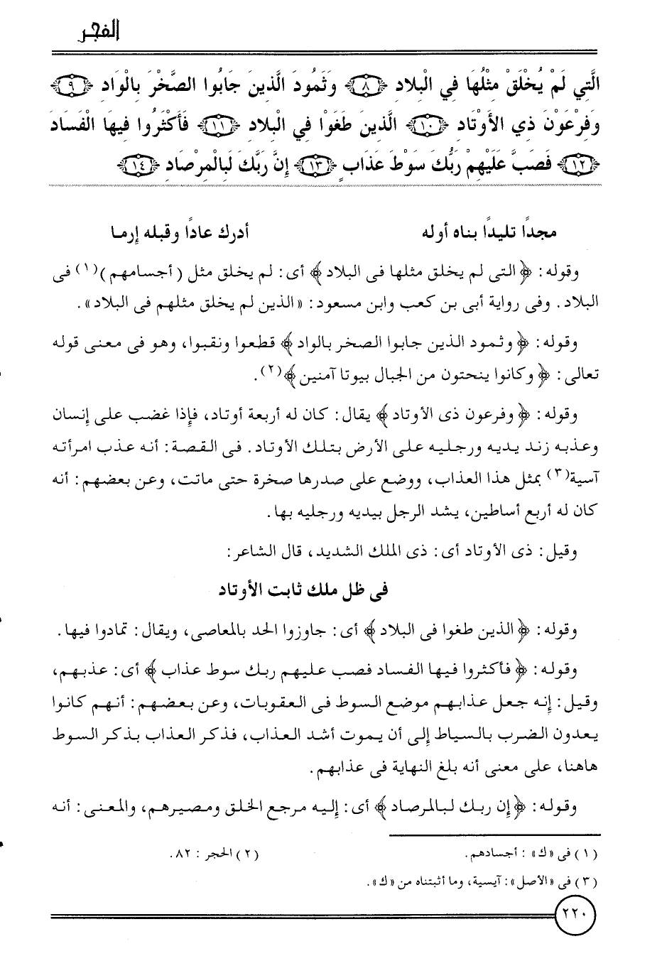 {الَّتِي لم يخلق مثلهَا فِي الْبِلَاد (8) وَثَمُود الَّذين جابوا الصخر بالواد (9) وَفرْعَوْن ذِي الْأَوْتَاد (10) الَّذين طغوا فِي الْبِلَاد (11) فَأَكْثرُوا فِيهَا الْفساد (12) فصب عَلَيْهِم رَبك سَوط عَذَاب (13) إِن رَبك لبالمرصاد (14) }