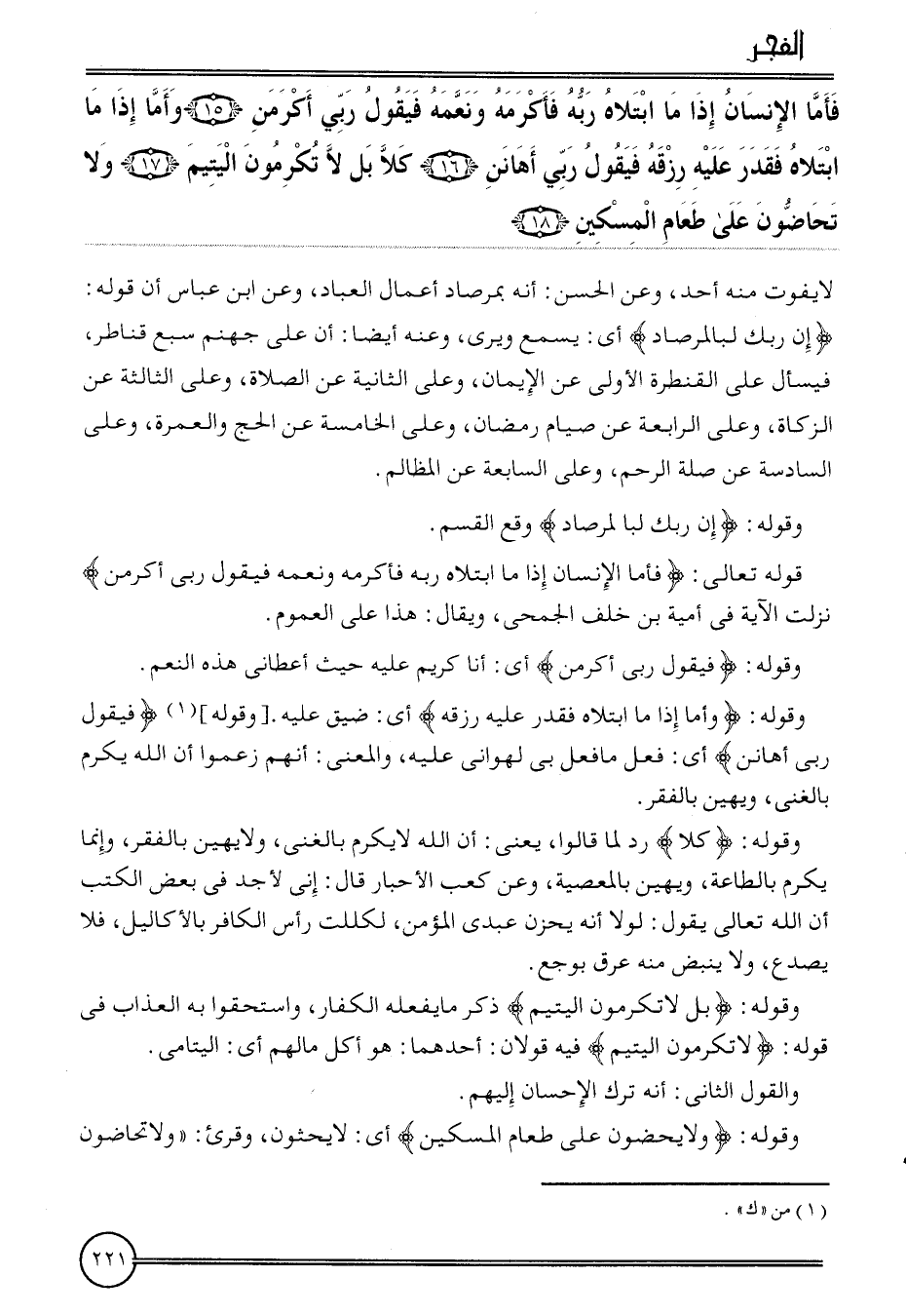 {فَأَما الْإِنْسَان إِذا مَا ابتلاه ربه فَأكْرمه ونعمه فَيَقُول رَبِّي أكرمن (15) وَأما إِذا مَا ابتلاه فَقدر عَلَيْهِ رزقه فَيَقُول رَبِّي أهانن (16) كلا بل لَا تكرمون الْيَتِيم (17) وَلَا تحاضون على طَعَام الْمِسْكِين (18) } لَا يفوت مِنْهُ أحد، وَعَن الْحسن: أَنه بمرصاد أَعمال الْعباد، وَعَن ابْن عَبَّاس أَن قَوْله: {إِن رَبك لبالمرصاد} أَي: يسمع وَيرى، وَعنهُ أَيْضا: أَن على جَهَنَّم سبع قناطر، فَيسْأَل على القنطرة الأولى عَن الْإِيمَان، وَعَن الثَّانِيَة عَن الصَّلَاة، وعَلى الثَّالِثَة عَن الزَّكَاة، وعَلى الرَّابِعَة عَن صِيَام رَمَضَان، وعَلى الْخَامِسَة عَن الْحَج وَالْعمْرَة، وعَلى السَّادِسَة عَن صلَة الرَّحِم، وعَلى السَّابِعَة عَن الْمَظَالِم.