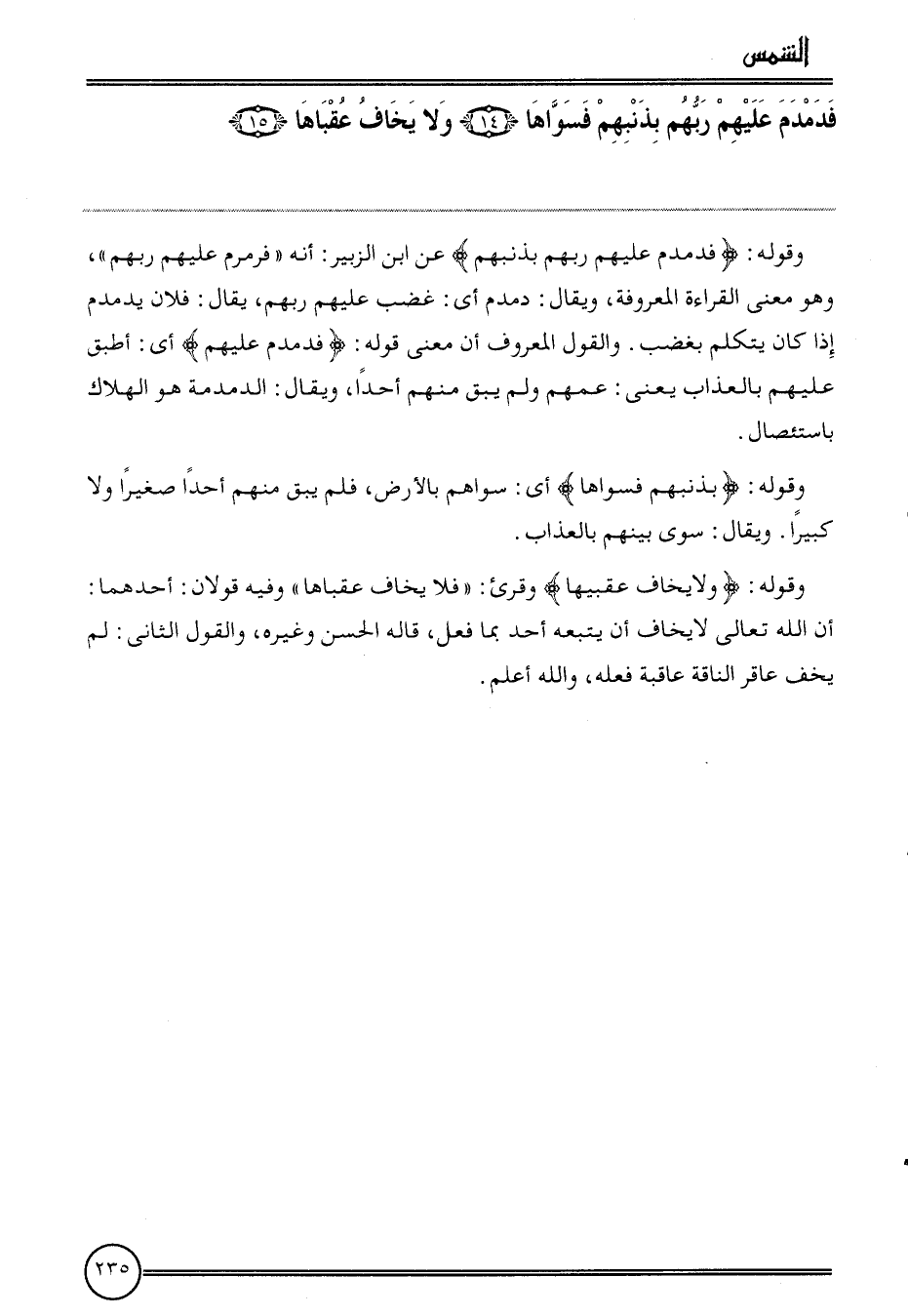 {فدمدم عَلَيْهِم رَبهم بذنبهم فسواها (14) وَلَا يخَاف عقباها (15) } .