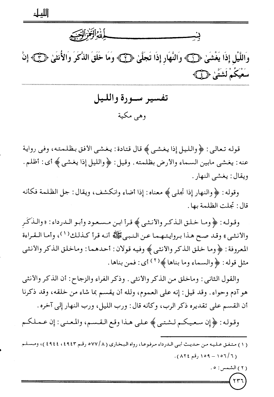 {وَاللَّيْل إِذا يغشى (1) وَالنَّهَار إِذا تجلى (2) وَمَا خلق الذّكر وَالْأُنْثَى (3) إِن سعيكم لشتى (4) } .