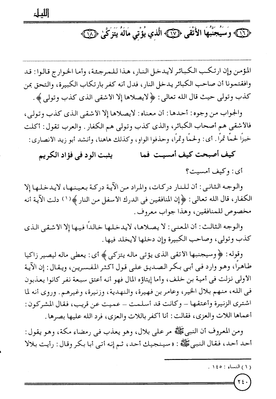 وَقَوله: {وسيجنبها الأتقى الَّذِي يُؤْتِي مَاله يتزكى} أَي: يُعْطي مَاله ليصير زاكيا طَاهِرا، وَهُوَ وَارِد فِي أبي بكر الصّديق على قَول أَكثر الْمُفَسّرين، وَيُقَال: إِن الْآيَة الأولى نزلت فِي أُميَّة بن خلف، وَأما إيتاؤه المَال فَهُوَ أَنه أعتق سَبْعَة نفر كَانُوا يُعَذبُونَ فِي الله، مِنْهُم بِلَال الْخَيْر، وعامر بن فهَيْرَة، والنهدية، وزنيرة، وَغَيرهم.