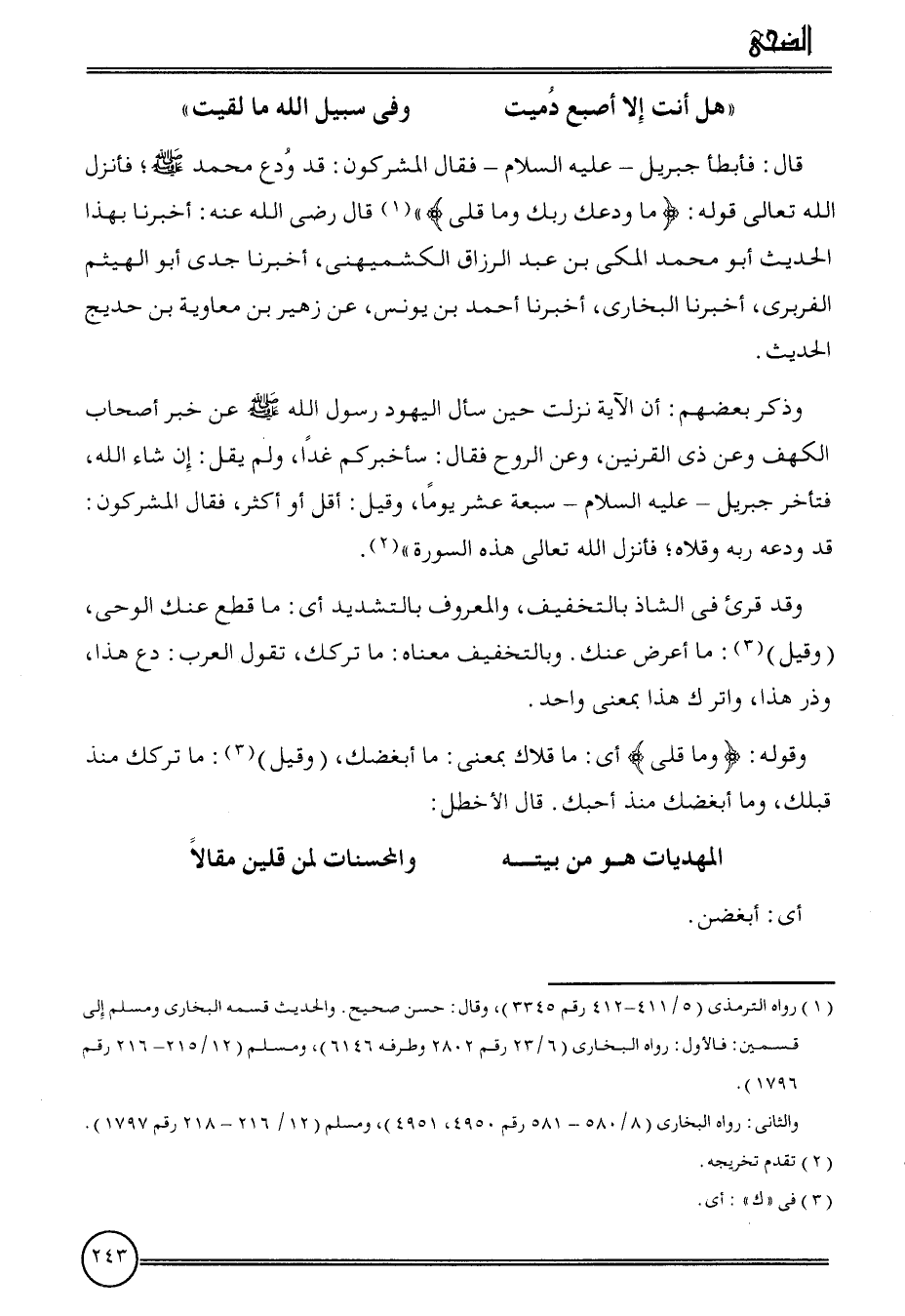 قَالَ: فَأَبْطَأَ جِبْرِيل - عَلَيْهِ السَّلَام - فَقَالَ الْمُشْركُونَ: قد ودع مُحَمَّد؛ فَأنْزل الله تَعَالَى قَوْله {مَا وَدعك رَبك وَمَا قلى} قَالَ رَضِي الله عَنهُ: أخبرنَا بِهَذَا الحَدِيث أَبُو مُحَمَّد الْمَكِّيّ بن عبد الرَّزَّاق الْكشميهني، أخبرنَا جدي أَبُو الْهَيْثَم الْفربرِي، أخبرنَا البُخَارِيّ، أخبرنَا أَحْمد بن يُونُس، عَن زُهَيْر بن مُعَاوِيَة بن حديج الحَدِيث.