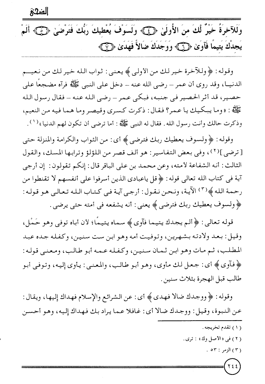 {وللآخرة خير لَك من الأولى (4) ولسوف يعطيك رَبك فترضى (5) ألم يجدك يَتِيما فآوى (6) ووجدك ضَالًّا فهدى (7) } .