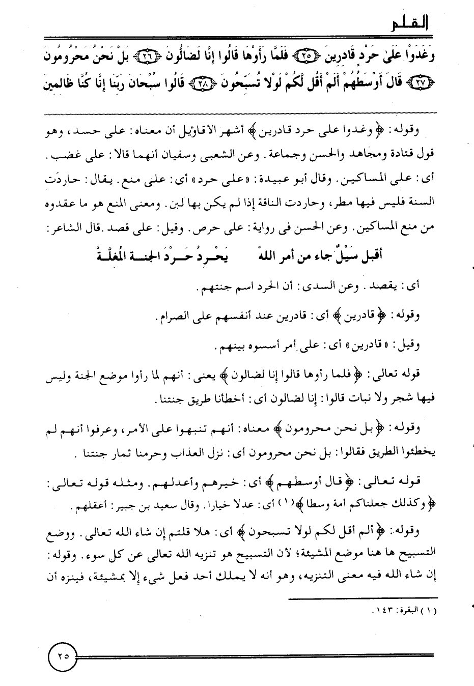 {وغدوا على حرد قَادِرين (25) فَلَمَّا رأوها قَالُوا إِنَّا لضالون (26) بل نَحن محرومون (27) قَالَ أوسطهم ألم أقل لكم لَوْلَا تسبحون (28) قَالُوا سُبْحَانَ رَبنَا إِن كُنَّا ظالمين} .