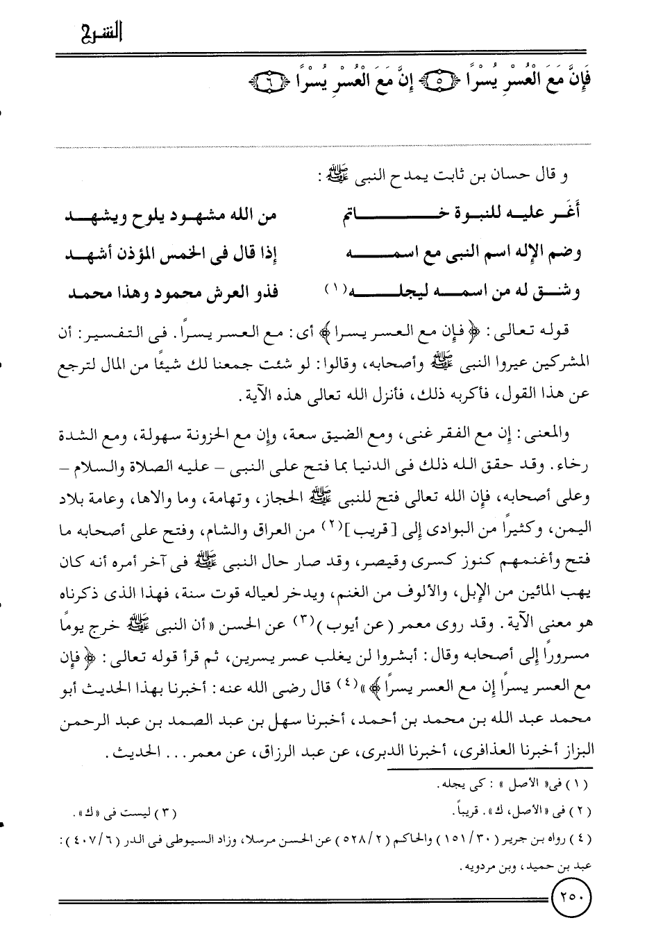 وَقد روى معمر (عَن أَيُّوب) عَن الْحسن " أَن النَّبِي خرج يَوْمًا مَسْرُورا إِلَى أَصْحَابه وَقَالَ: أَبْشِرُوا لن يغلب عسر يسرين، ثمَّ قَرَأَ قَوْله تَعَالَى: {فَإِن مَعَ الْعسر يسرا إِن مَعَ الْعسر يسرا} قَالَ رَضِي الله عَنهُ: أخبرنَا بِهَذَا الحَدِيث أَبُو مُحَمَّد عبد الله بن مُحَمَّد بن أَحْمد، أخبرنَا سهل بن عبد الصَّمد بن عبد الرَّحْمَن البرَاز أخبرنَا العذافري، أخبرنَا الدبرِي، عَن عبد الرَّزَّاق، عَن معمر ... الحَدِيث.