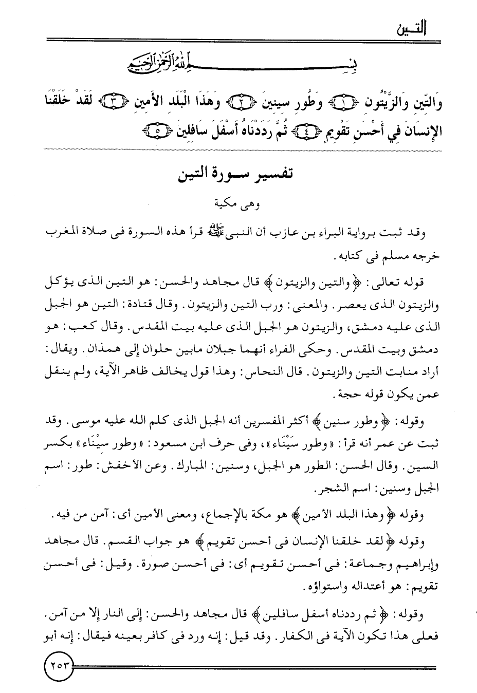 {والتين وَالزَّيْتُون (1) وطور سينين (2) وَهَذَا الْبَلَد الْأمين (3) لقد خلقهَا الْإِنْسَان فِي أحسن تَقْوِيم (4) ثمَّ رددناه أَسْفَل سافلين (5) }