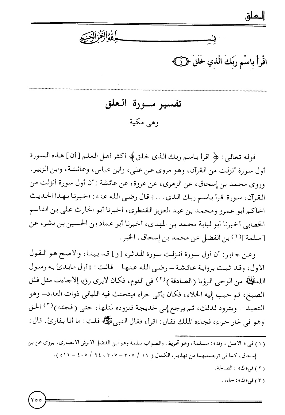 قَوْله تَعَالَى: {اقْرَأ باسم رَبك الَّذِي خلق} أَكثر أهل الْعلم [أَن] هَذِه السُّورَة أول سُورَة أنزلت من الْقُرْآن، وَهُوَ مَرْوِيّ عَن عَليّ، وَابْن عَبَّاس، وَعَائِشَة، وَابْن الزبير.