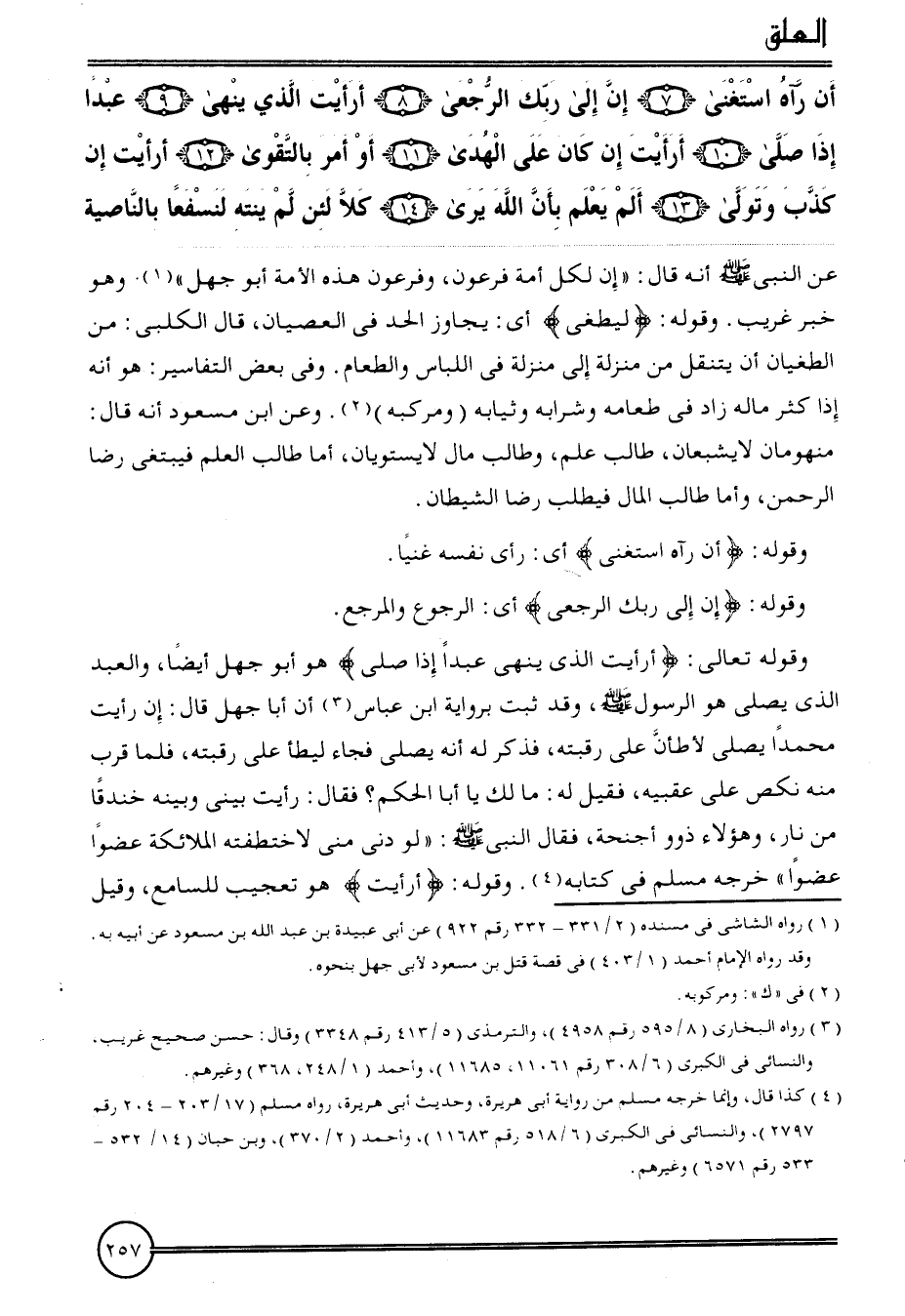 {أَن رَآهُ اسْتغنى (7) إِن إِلَى رَبك الرجعى (8) أَرَأَيْت الَّذِي ينْهَى (9) عبدا إِذا صلى (10) أَرَأَيْت إِن كَانَ على الْهدى (11) أَو أَمر بالتقوى (12) أَرَأَيْت إِن كذب وَتَوَلَّى (13) ألم يعلم بِأَن الله يرى (14) كلا لَئِن لم ينْتَه لنسفعا بالناصية} عَن النَّبِي أَنه قَالَ: " إِن لكل أمة فِرْعَوْن، وَفرْعَوْن هَذِه الْأمة أَو جهل ".