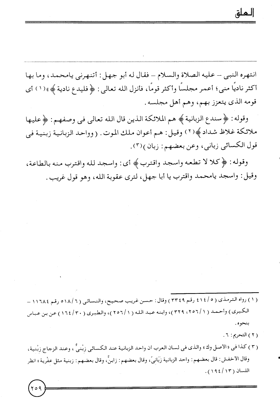 انتهره النَّبِي - عَلَيْهِ الصَّلَاة وَالسَّلَام - فَقَالَ لَهُ أَبُو جهل: أتنهرني يَا مُحَمَّد، وَمَا بهَا أَكثر نَادِيًا مني؛ أعمر مَجْلِسا وَأكْثر قوما، فَأنْزل الله تَعَالَى: {فَليدع نَادِيَةَ} أَي قومه الَّذِي يتعزز بهم، وهم أهل مَجْلِسه.