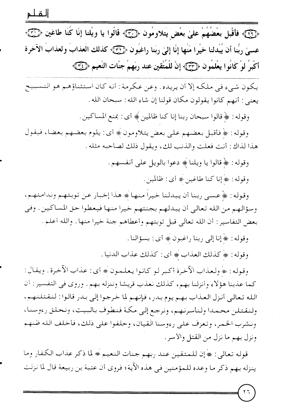 ( {29) فَأقبل بَعضهم على بعض يتلاومون (30) قَالُوا يَا ويلنا إِنَّا كُنَّا طاغين (31) عَسى رَبنَا أَن يبدلنا خيرا مِنْهَا إِنَّا إِلَى رَبنَا راغبون (32) كَذَلِك الْعَذَاب ولعذاب الْآخِرَة أكبر لَو كَانُوا يعلمُونَ (33) إِن لِلْمُتقين عِنْد رَبهم جنا النَّعيم (34) } .
