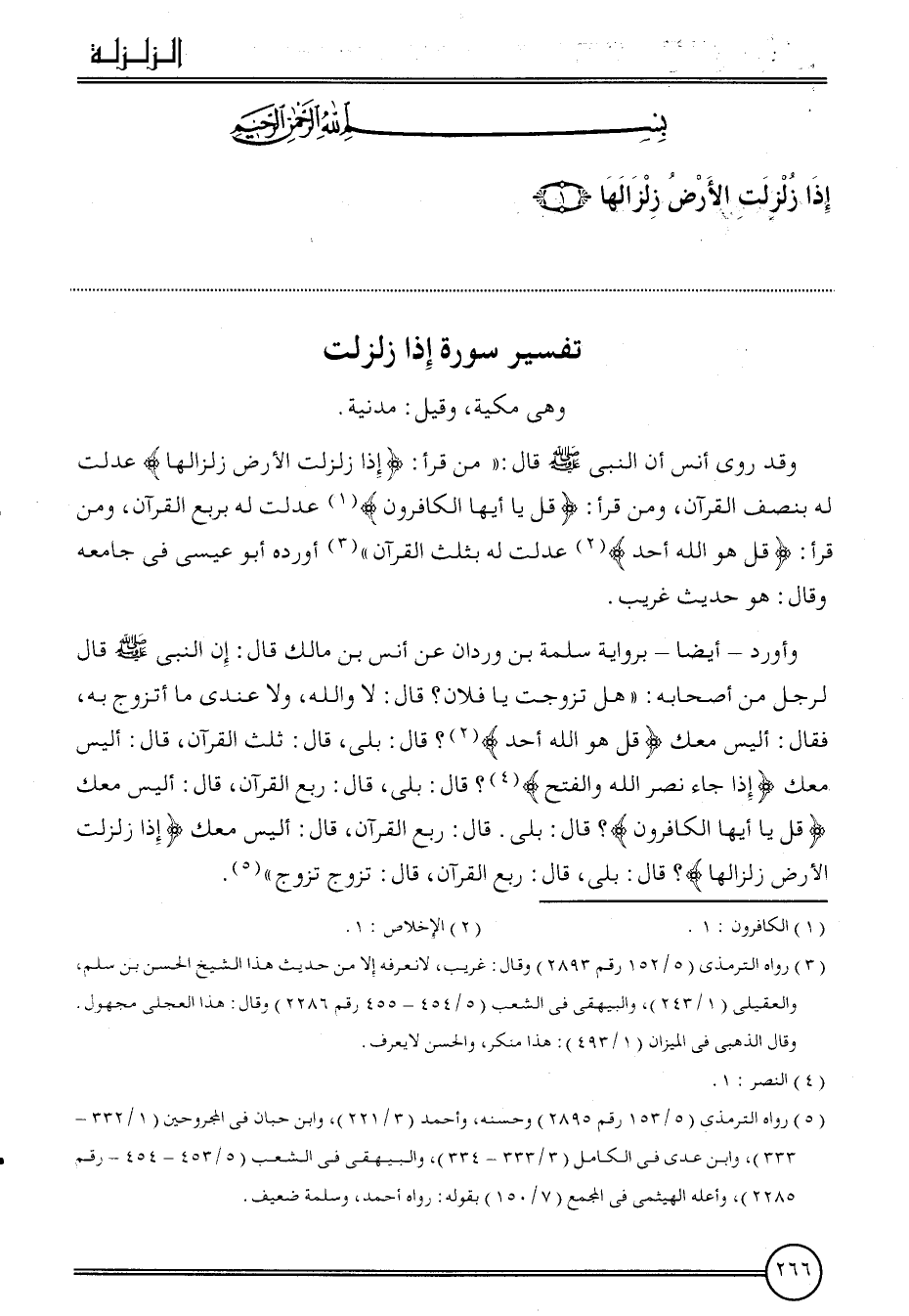 وَقد روى أنس أَن النَّبِي قَالَ: " من قَرَأَ: {إِذا زلزلت الأَرْض زِلْزَالهَا} عدلت لَهُ بِنصْف الْقُرْآن، وَمن قَرَأَ: {قل يَا أَيهَا الْكَافِرُونَ} عدلت لَهُ بِربع الْقُرْآن، وَمن قَرَأَ: {قل هُوَ الله أحد} عدلت بِثلث الْقُرْآن " أوردهُ أَبُو عِيسَى فِي جَامعه وَقَالَ: هُوَ حَدِيث غَرِيب.