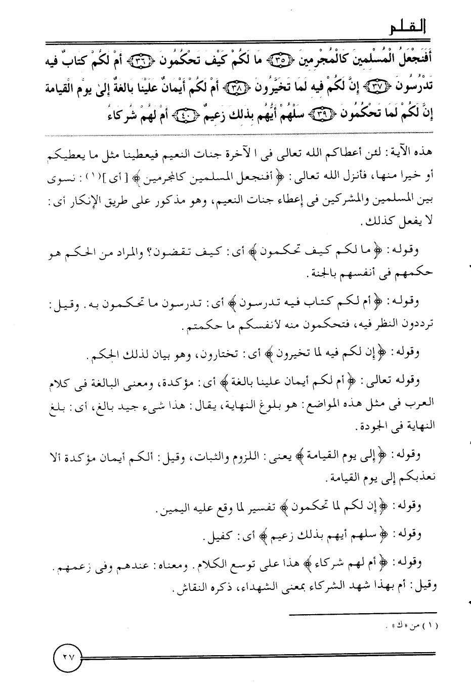 {أفنجعل الْمُسلمين كالمجرمين (35) مَا لكم كَيفَ تحكمون (36) أم لكم كتاب فِيهِ تدرسون (37) إِن لكم فِيهِ لما تخيرون (38) أم لكم أَيْمَان علينا بَالِغَة إِلَى يَوْم الْقِيَامَة إِن لكم لما تحكمون (39) سلهم أَيهمْ بذلك زعيم (40) أم لَهُم شُرَكَاء} . هَذِه الْآيَة: لَئِن أَعْطَاكُم الله تَعَالَى فِي الْآخِرَة جنَّات النَّعيم فيعطينا مثل مَا يعطيكم أَو خيرا مِنْهَا،