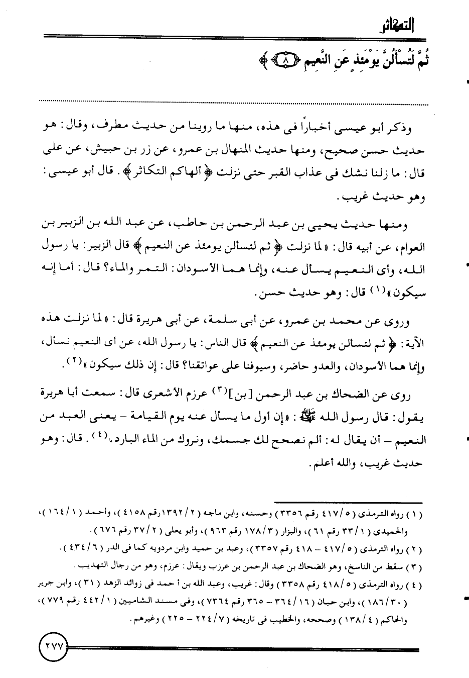 وَمِنْهَا حَدِيث يحيى بن عبد الرَّحْمَن بن حَاطِب، عَن عبد الله بن الزبير بن الْعَوام، عَن أَبِيه قَالَ: " لما نزلت {ثمَّ لتسألن يَوْمئِذٍ عَن النَّعيم} قَالَ الزبير: يَا رَسُول الله، وَأي النَّعيم يسْأَل عَنهُ، وَإِنَّمَا هما الأسودان: التَّمْر وَالْمَاء؟ قَالَ: أما إِنَّه سَيكون " قَالَ: وَهُوَ حَدِيث حسن.