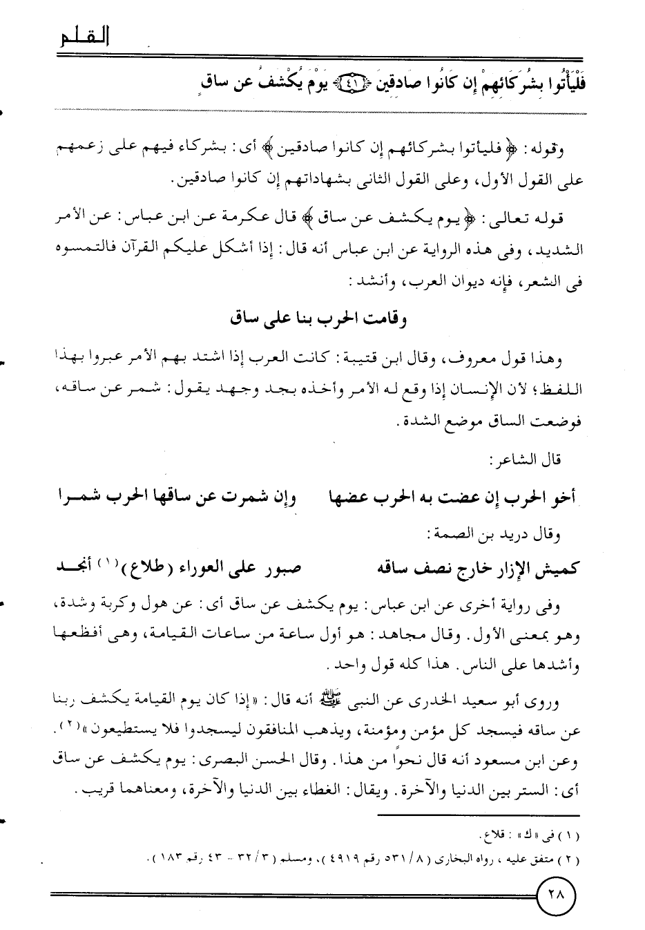 قَوْله تَعَالَى: {يَوْم يكْشف عَن سَاق} قَالَ عِكْرِمَة عَن ابْن عَبَّاس: عَن الْأَمر الشَّديد، وَفِي هَذِه الرِّوَايَة عَن ابْن عَبَّاس أَنه قَالَ: إِذا أشكل عَلَيْكُم الْقُرْآن فالتمسوه فِي الشّعْر، فَإِنَّهُ ديوَان الْعَرَب، وَأنْشد: