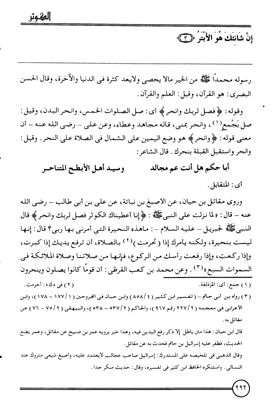 وروى مقَاتل بن حَيَّان، عَن الْأَصْبَغ بن نباتة، عَن عَليّ بن أبي طَالب - رَضِي الله عَنهُ - قَالَ: " لما نزلت على النَّبِي {إِنَّا أعطيناك الْكَوْثَر فصل لِرَبِّك وانحر} قَالَ النَّبِي لجبريل - عَلَيْهِ السَّلَام -: مَا هَذِه النحيرة الَّتِي أَمرنِي بهَا رَبِّي؟ قَالَ: إِنَّهَا لَيست بنحيرة، وَلكنه يَأْمُرك إِذا (تحرمت) بِالصَّلَاةِ، أَن ترفع يَديك إِذا كَبرت، وَإِذا ركعت، وَإِذا رفعت رَأسك من الرُّكُوع، فَإِنَّهَا من صَلَاتنَا وَصَلَاة الْمَلَائِكَة فِي السَّمَوَات السَّبع.