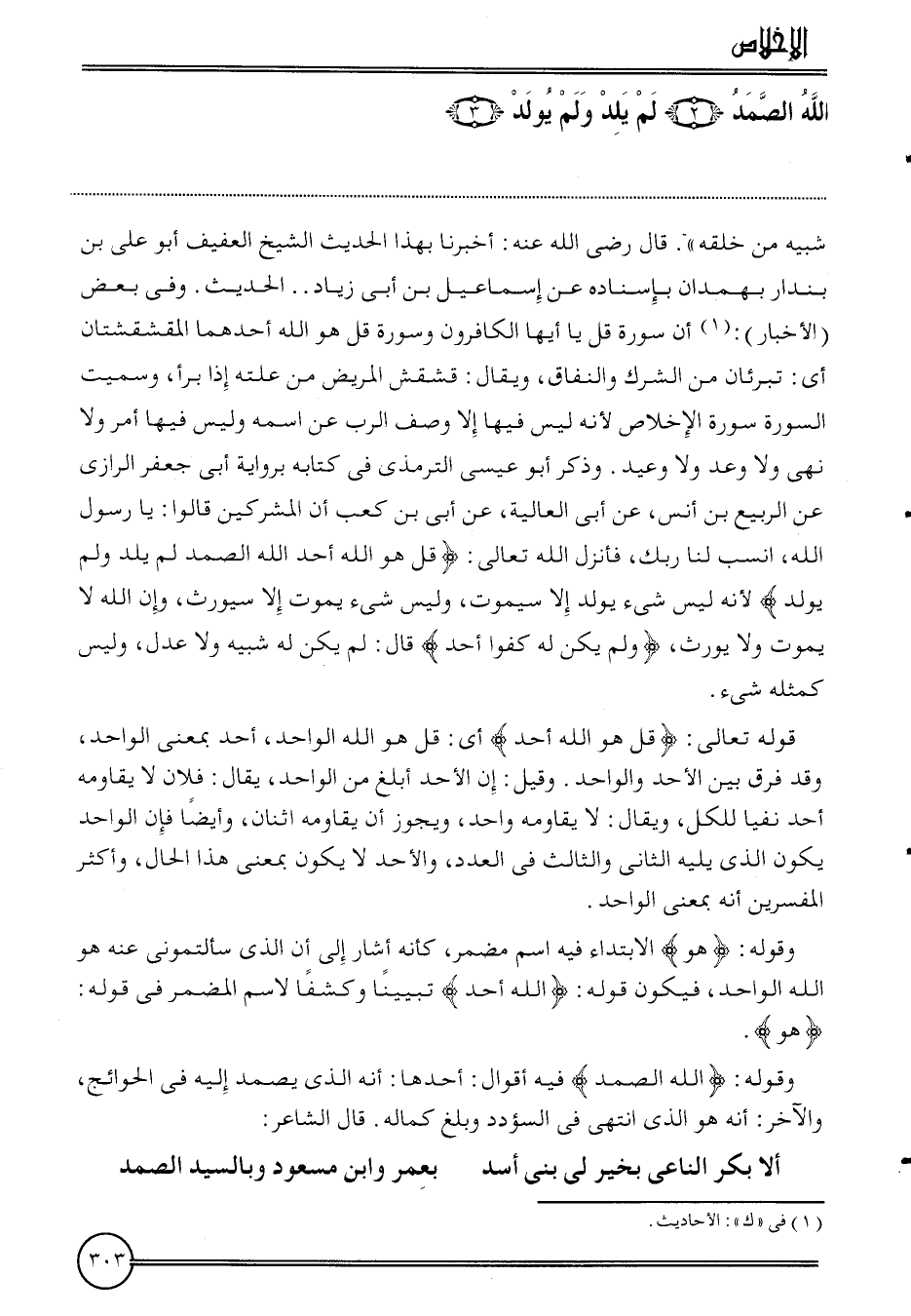 وَقَوله: {الله الصَّمد} فِيهِ أَقْوَال: أَحدهَا: أَنه الَّذِي يصمد إِلَيْهِ فِي الْحَوَائِج، وَالْآخر: أَنه هُوَ الَّذِي انْتهى فِي السؤدد وَبلغ كَمَاله.