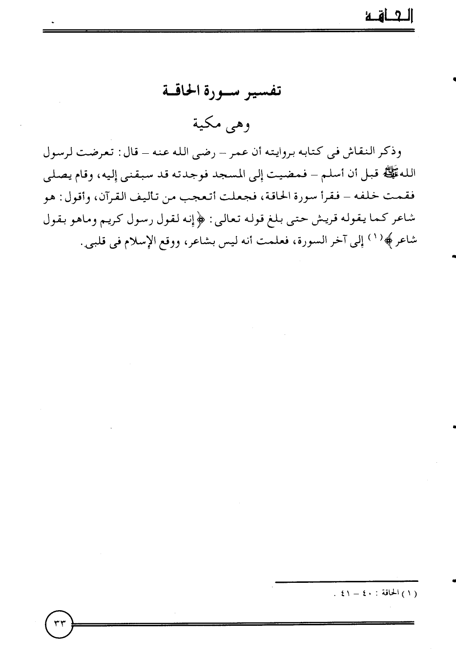 وَذكر النقاش فِي كِتَابه بروايته أَن عمر - رَضِي الله عَنهُ - قَالَ: تعرضت لرَسُول الله قبل أَن أسلم - فمضيت إِلَى الْمَسْجِد فَوَجَدته قد سبقني إِلَيْهِ، وَقَامَ يُصَلِّي فَقُمْت خَلفه - فَقَرَأَ سُورَة الحاقة، فَجعلت أتعجب من تأليف الْقُرْآن، وَأَقُول: هُوَ شَاعِر كَمَا يَقُوله قُرَيْش حَتَّى بلغ قَوْله تَعَالَى: {إِنَّه لقَوْل رَسُول كريم مَا هُوَ بقول شَاعِر} إِلَى آخر السُّورَة، فَعلمت أَنه لَيْسَ بشاعر، وَوَقع الْإِسْلَام فِي قلبِي.