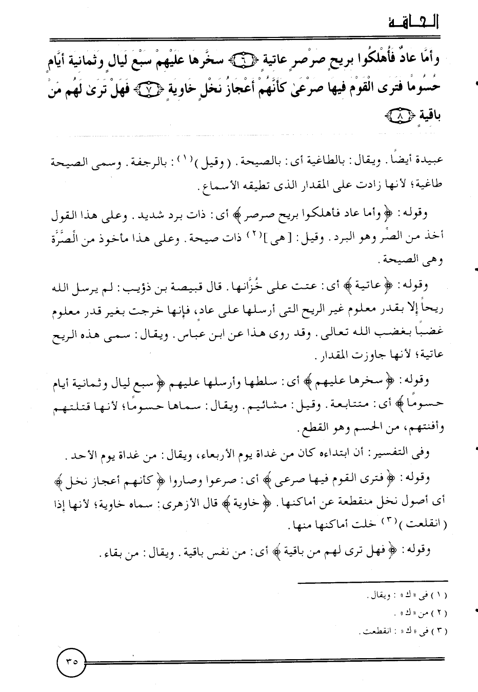 {وَأما عَاد فأهلكوا برِيح صَرْصَر عَاتِيَة (6) سخرها عَلَيْهِم سبع لَيَال وَثَمَانِية أَيَّام حسوما فترى الْقَوْم فِيهَا صرعى كَأَنَّهُمْ أعجاز نخل خاوية (7) فَهَل ترى لَهُم من بَاقِيَة (8) } . عُبَيْدَة أَيْضا.
