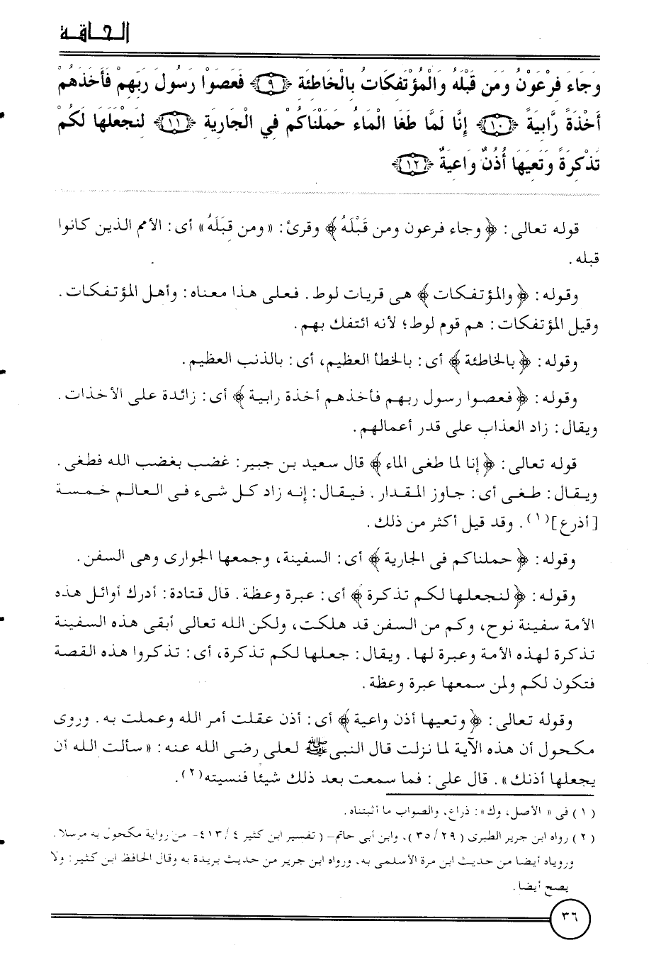 {وَجَاء فِرْعَوْن وَمن قبله والمؤتفكات بالخاطئة (9) فعصوا رَسُول رَبهم فَأَخذهُم أَخْذَة رابية (10) إِنَّا لما طغا المَاء حَمَلْنَاكُمْ فِي الْجَارِيَة (11) لنجعلها لكم تذكرة وَتَعيهَا أذن وَاعِيَة (12) } .