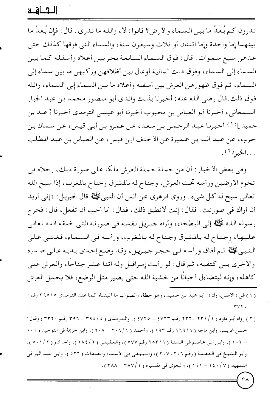 قَالَ: فَوق السَّمَاء السَّابِعَة بَحر بَين أَعْلَاهُ وأسفله كَمَا بَين السَّمَاء إِلَى السَّمَاء، وَفَوق ذَلِك ثَمَانِيَة أوعال بَين أظلافهن وركبهن مَا بَين سَمَاء إِلَى السَّمَاء، ثمَّ فَوق ظهورهن الْعَرْش بَين أَسْفَله وَأَعلاهُ مَا بَين السَّمَاء إِلَى السَّمَاء، وَالله فَوق ذَلِك.