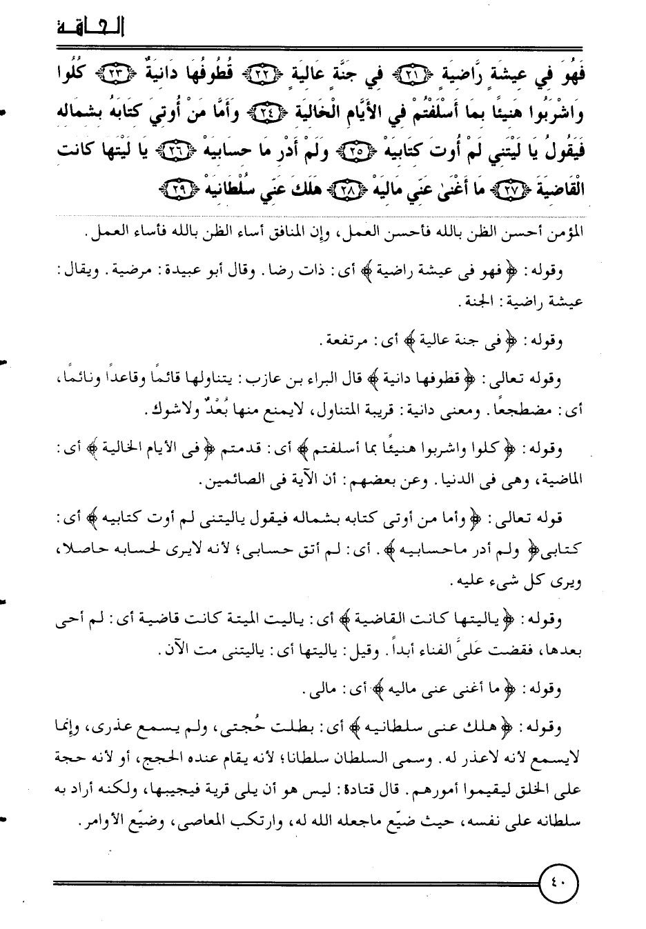 {فَهُوَ فِي عيشة راضية (21) فِي جنَّة عالية (22) قطوفها دانية (23) كلوا وَاشْرَبُوا هَنِيئًا بِمَا أسلفتم فِي الْأَيَّام الخالية (24) وَأما من أُوتِيَ كِتَابه بِشمَالِهِ فَيَقُول يَا لَيْتَني لم أوت كِتَابيه (25) وَلم أدر مَا حسابيه (26) يَا ليتها كَانَت القاضية (27) مَا أغْنى عني مَالِيَّة (28) هلك عني سلطانيه (29) } . الْمُؤمن أحسن الظَّن بِاللَّه فَأحْسن الْعَمَل، وَإِن الْمُنَافِق أَسَاءَ الظَّن بِاللَّه فأساء الْعَمَل.