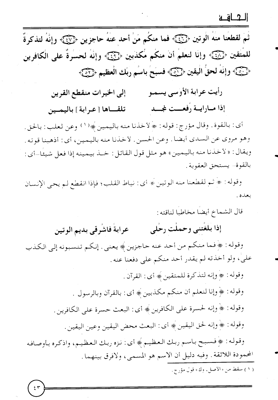 {ثمَّ لقطعنا مِنْهُ الوتين (46) فَمَا مِنْكُم من أحد عَنهُ حاجزين (47) وَإنَّهُ لتذكرة لِلْمُتقين (48) وَإِنَّا لنعلم أَن مِنْكُم مكذبين (49) وَإنَّهُ لحسرة على الْكَافرين (50) وَإنَّهُ لحق الْيَقِين (51) فسبح باسم رَبك الْعَظِيم (52) } .