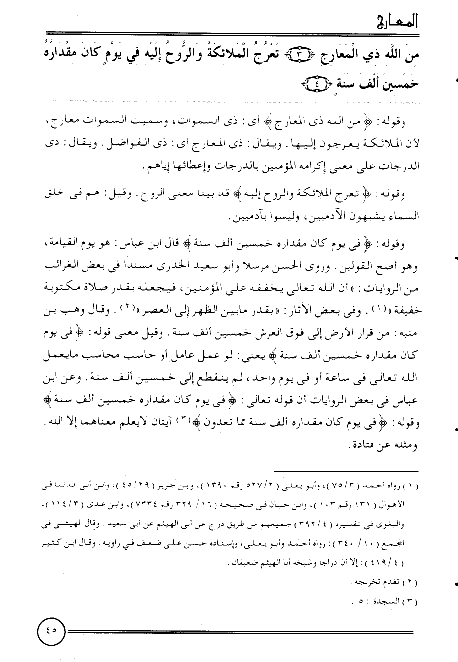 {من الله ذِي المعارج (3) تعرج الْمَلَائِكَة وَالروح إِلَيْهِ فِي يَوْم كَانَ مِقْدَاره خمسين ألف سنة (4) } .