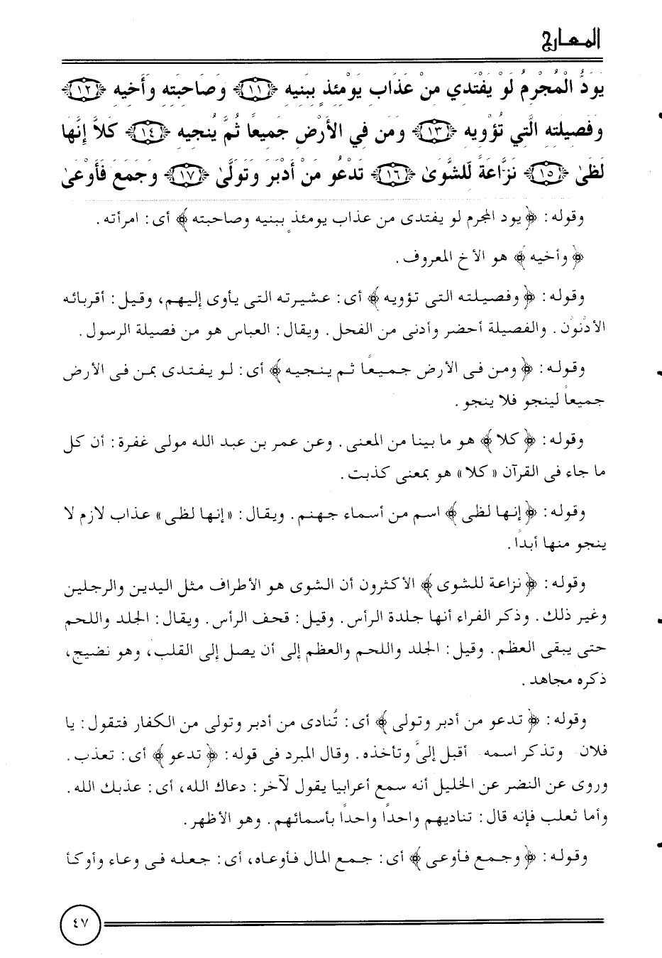 {يود المجرم لَو يفتدي من عَذَاب يَوْمئِذٍ ببنيه (11) وصاحبته وأخيه (12) وفصيلته الَّتِي تؤويه (13) وَمن فِي الأَرْض جَمِيعًا ثمَّ ينجيه (14) كلا إِنَّهَا لظى (15) نزاعة للشوى (16) تَدْعُو من أدبر وَتَوَلَّى (17) وَجمع فأوعى}
