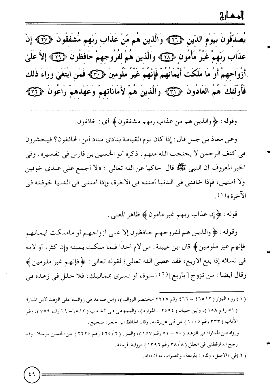 {يصدقون بِيَوْم الدّين (26) وَالَّذين هم من عَذَاب رَبهم مشفقون (27) إِن عَذَاب رَبهم غير مَأْمُون (28) وَالَّذين هم لفروجهم حافظون (29) إِلَّا على أَزوَاجهم أَو مَا ملكت أَيْمَانهم فَإِنَّهُم غير ملومين (29) فَمن ابْتغى وَرَاء ذَلِك فَأُولَئِك هم العادون (31) وَالَّذين هم لأمانتهم وَعَهْدهمْ رَاعُونَ (32) } .