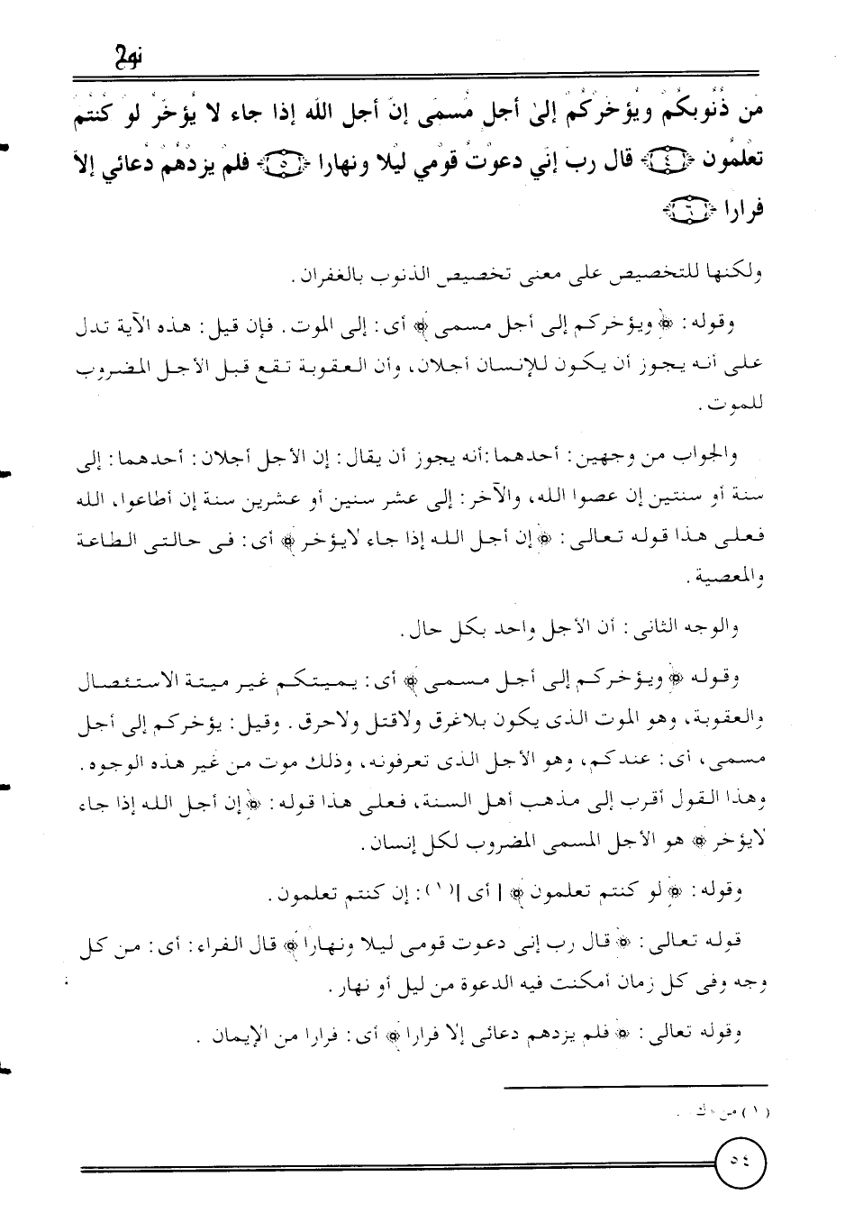 وَالْجَوَاب من وَجْهَيْن: أَحدهمَا: أَنه يجوز أَن يُقَال: إِن الْأَجَل أجلان: أَحدهمَا: إِلَى سنة أَو سنتَيْن إِن عصوا الله، وَالْآخر: إِلَى عشر سِنِين أَو عشْرين سنة إِن أطاعوا الله، فعلى هَذَا قَوْله تَعَالَى: {إِن أجل الله إِذا جَاءَ لَا يُؤَخر} أَي: فِي حالتي الطَّاعَة وَالْمَعْصِيَة.