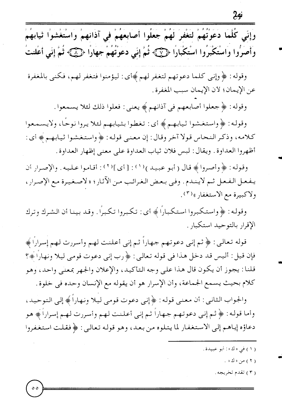 قَوْله تَعَالَى: {ثمَّ إِنِّي دعوتهم جهارا ثمَّ إِنِّي أعلنت لَهُم وأسررت لَهُم إسرارا} فَإِن قيل: أَلَيْسَ قد دخل هَذَا فِي قَوْله تَعَالَى: (رب إِنِّي دَعَوْت قومِي لَيْلًا وَنَهَارًا) ؟ قُلْنَا: كَلَام بِحَيْثُ يجوز أَن يكون قَالَ هَذَا على وَجه التَّأْكِيد، والإعلان والجهر بِمَعْنى وَاحِد، وَهُوَ كَلَام بِحَيْثُ يسمع الْجَمَاعَة، وَأَن الْإِسْرَار هُوَ أَن يَقُوله مَعَ الْإِنْسَان وَحده فِي خلْوَة.