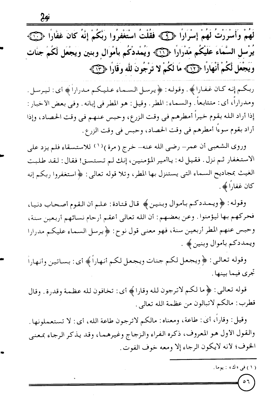 {لَهُم وأسررت لَهُم إسرارا (9) فَقلت اسْتَغْفرُوا ربكُم إِنَّه كَانَ غفارًا (10) يُرْسل السَّمَاء عَلَيْكُم مدرارا (11) ويمددكم بأموال وبنين وَيجْعَل لكم جنَّات وَيجْعَل لكم أَنهَارًا (12) مَا لكم لَا ترجون لله وقارا (13) } . ربكُم إِنَّه كَانَ غفارًا) .