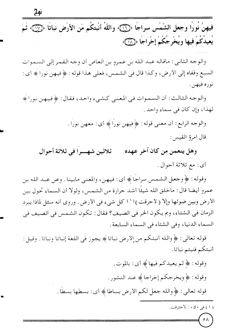 {فِيهِنَّ نورا وَجعل الشَّمْس سِرَاجًا (16) وَالله أنبتكم من الأَرْض نباتا (17) ثمَّ يعيدكم فِيهَا ويخرجكم إخراجا (18) .