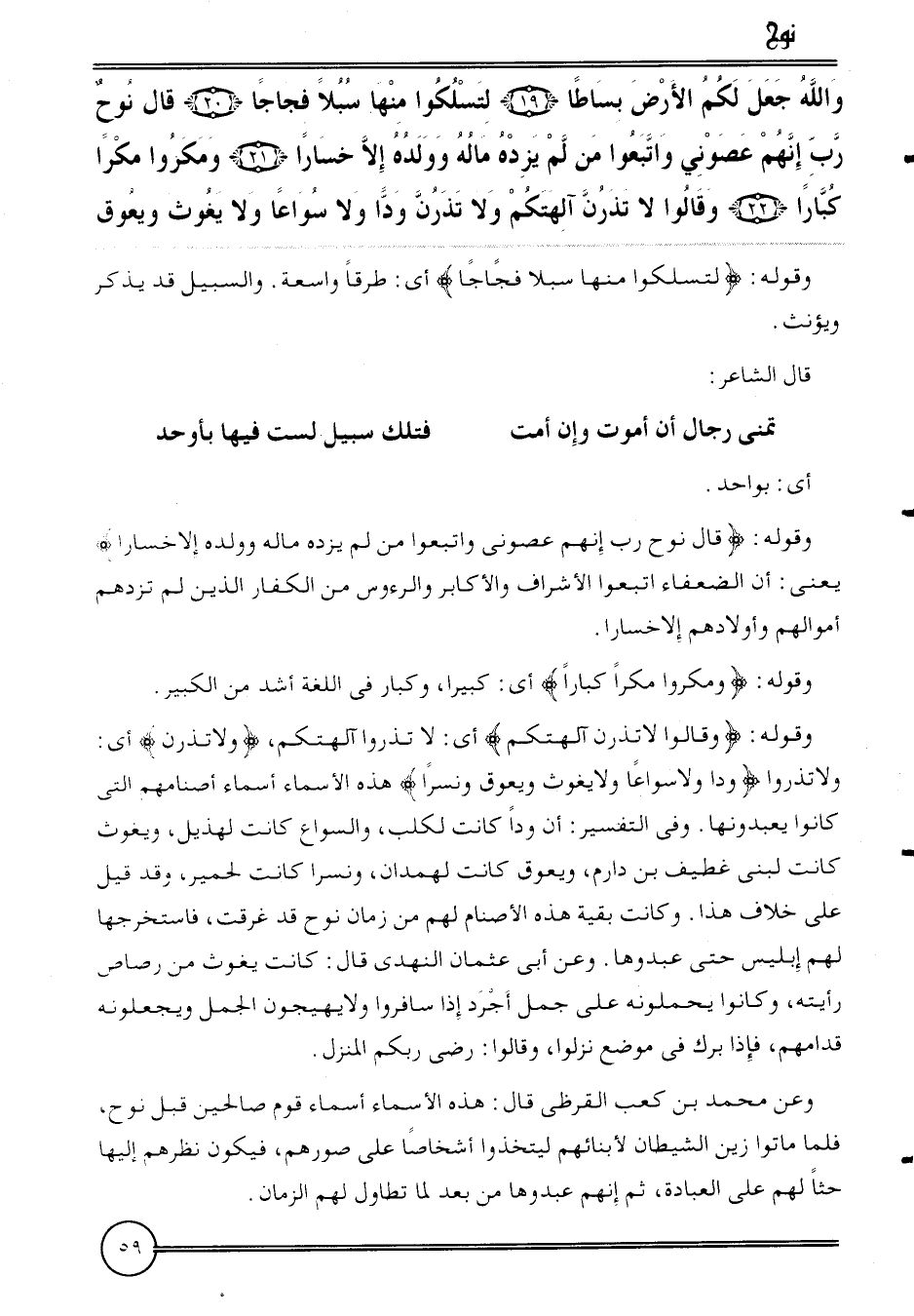 {وَالله جعل لكم الأَرْض بساطا (19) لتسلكوا مِنْهَا سبلا فجاجا (20) قَالَ نوح رب إِنَّهُم عصوني وَاتبعُوا من لم يزده مَاله وَولده إِلَّا خسارا (21) ومكروا مكرا كبارًا (22) وَقَالُوا لَا تذرن آلِهَتكُم لَا تذرن ودا وَلَا سواعا وَلَا يَغُوث ويعوق}