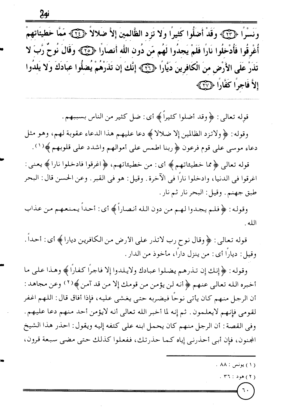 {ونسرا (23) وَقد أَضَلُّوا كثيرا وَلَا تزد الظَّالِمين إِلَّا ضلالا (24) مِمَّا خطيئاتهم أغرقوا فأدخلوا نَارا فَلم يَجدوا لَهُم من دون الله أنصارا (25) وَقَالَ نوح رب لَا تذر على الأَرْض من الْكَافرين ديارًا (26) إِنَّك إِن تذرهم يضلوا عِبَادك وَلَا يلدوا إِلَّا فَاجِرًا كفَّارًا (27) .
