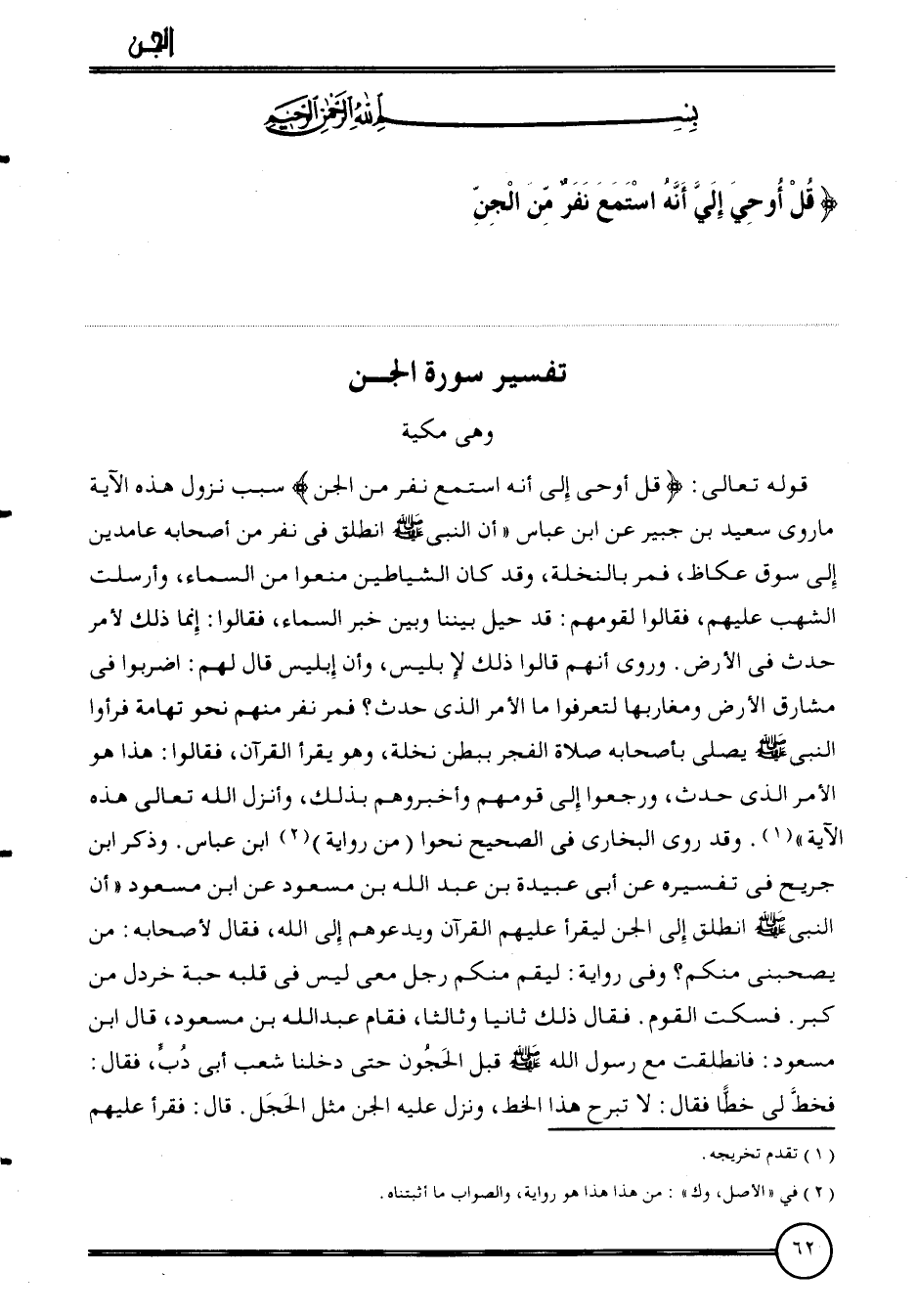 وَذكر ابْن جريح فِي تَفْسِيره عَن أبي عُبَيْدَة بن عبد الله بن مَسْعُود عَن ابْن مَسْعُود " أَن النَّبِي انْطلق إِلَى الْجِنّ ليقْرَأ عَلَيْهِم الْقُرْآن ويدعوهم إِلَى الله، فَقَالَ لأَصْحَابه: من يصحبني مِنْكُم؟ وَفِي رِوَايَة: ليقمْ مِنْكُم رجل معي لَيْسَ فِي قلبه حَبَّة خَرْدَل من كبر.