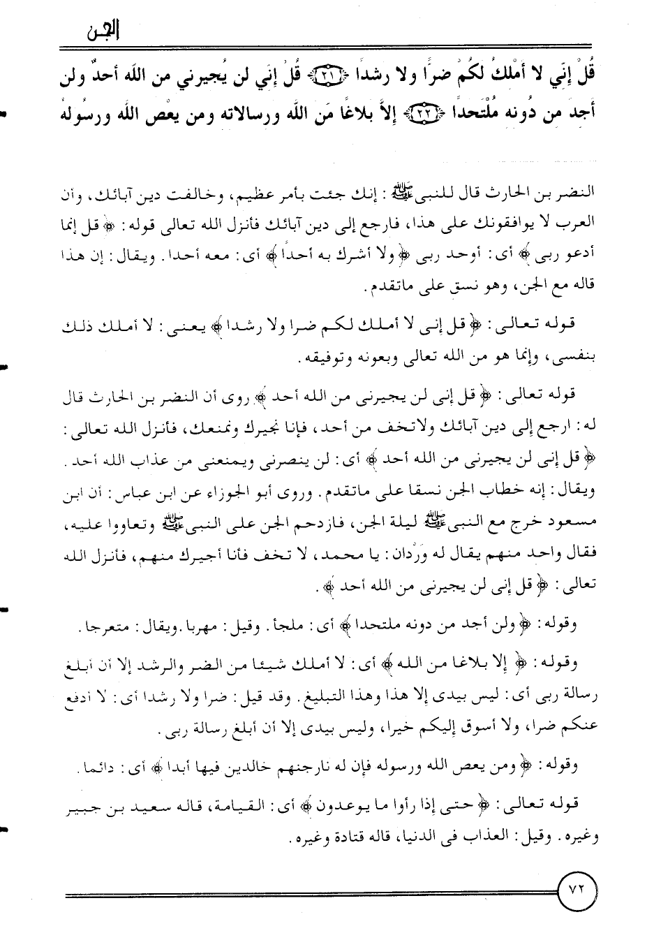 {قل إِنِّي لَا أملك لكم ضرا وَلَا رشدا (21) قل إِنِّي لن يجيرني من الله أحد وَلنْ أجد من دونه ملتحدا (22) إِلَّا بلاغا من الله ورسالاته وَمن يعْص الله وَرَسُوله} النَّضر بن الْحَارِث قَالَ للنَّبِي: إِنَّك جِئْت بِأَمْر عَظِيم، وخالفت دين آبَائِك، وَأَن الْعَرَب لَا يوافقونك على هَذَا، فَارْجِع إِلَى دين آبَائِك فَأنْزل الله تَعَالَى قَوْله: {قل إِنَّمَا أدعوا رَبِّي} أَي: أوحد رَبِّي {وَلَا أشرك بِهِ أحدا} أَي: مَعَه أحدا.