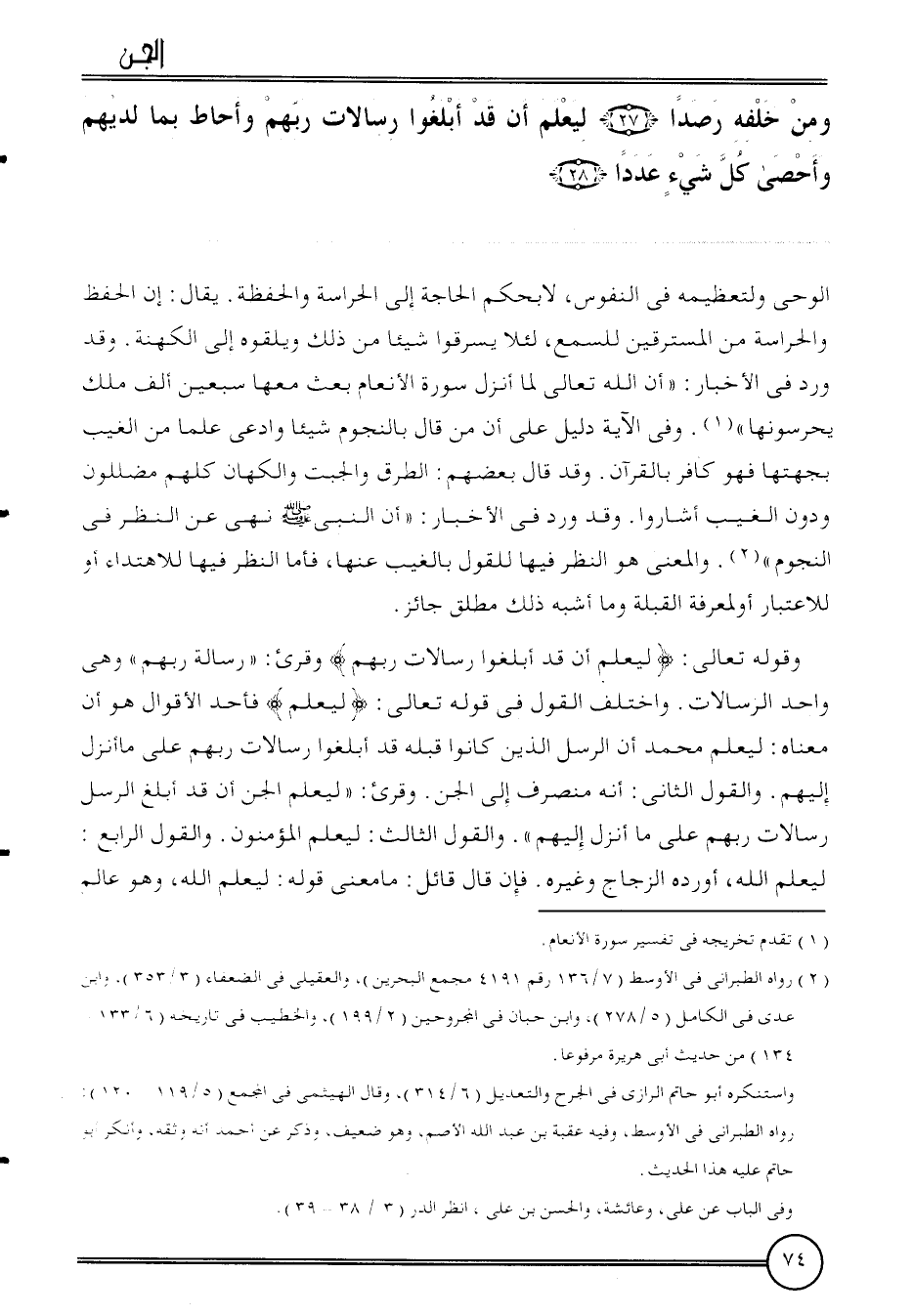 وَاخْتلف القَوْل فِي قَوْله تَعَالَى: {ليعلم} فأحد الْأَقْوَال هُوَ أَن مَعْنَاهُ: ليعلم مُحَمَّد أَن الرُّسُل الَّذين كَانُوا قبله قد أبلغوا رسالات رَبهم على مَا أنزل إِلَيْهِم.