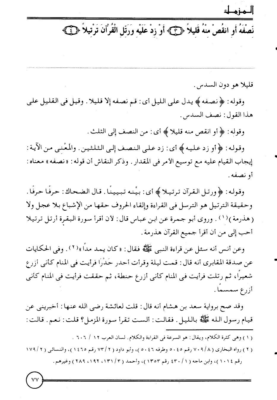 {نصفه أَو انقص مِنْهُ قَلِيلا (3) أَو زد عَلَيْهِ ورتل الْقُرْآن ترتيلا (4) } . قَلِيلا هُوَ دون السُّدس.