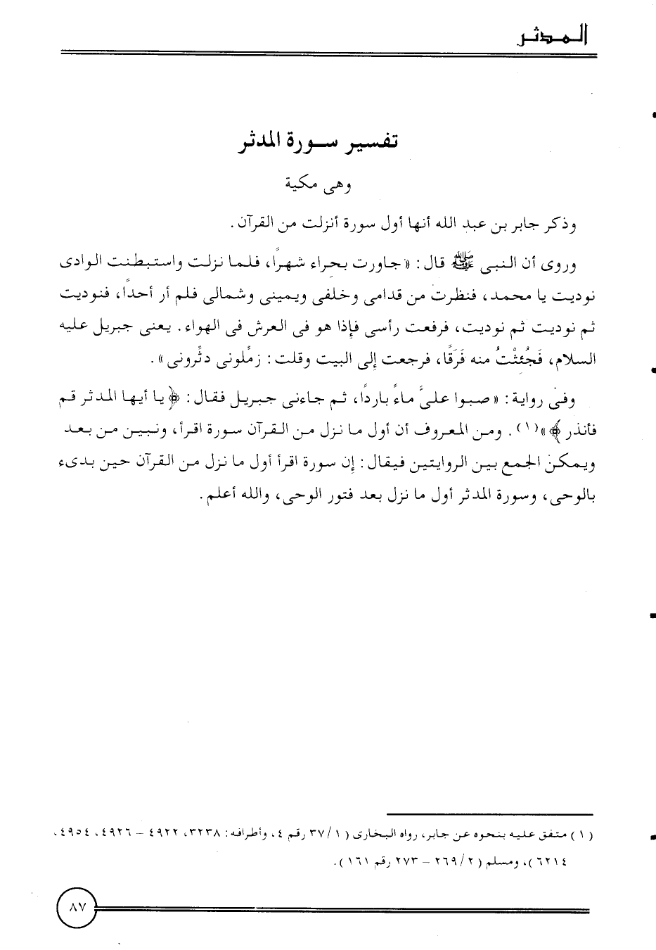 وَمن الْمَعْرُوف أَن أول مَا نزل من الْقُرْآن سُورَة اقْرَأ، ونبين من بعد وَيُمكن الْجمع بَين الرِّوَايَتَيْنِ فَيُقَال: إِن سُورَة اقْرَأ أول مَا نزل من الْقُرْآن حِين بُدِئَ بِالْوَحْي، وَسورَة المدثر أول مَا نزل بعد فتور الْوَحْي، وَالله أعلم.