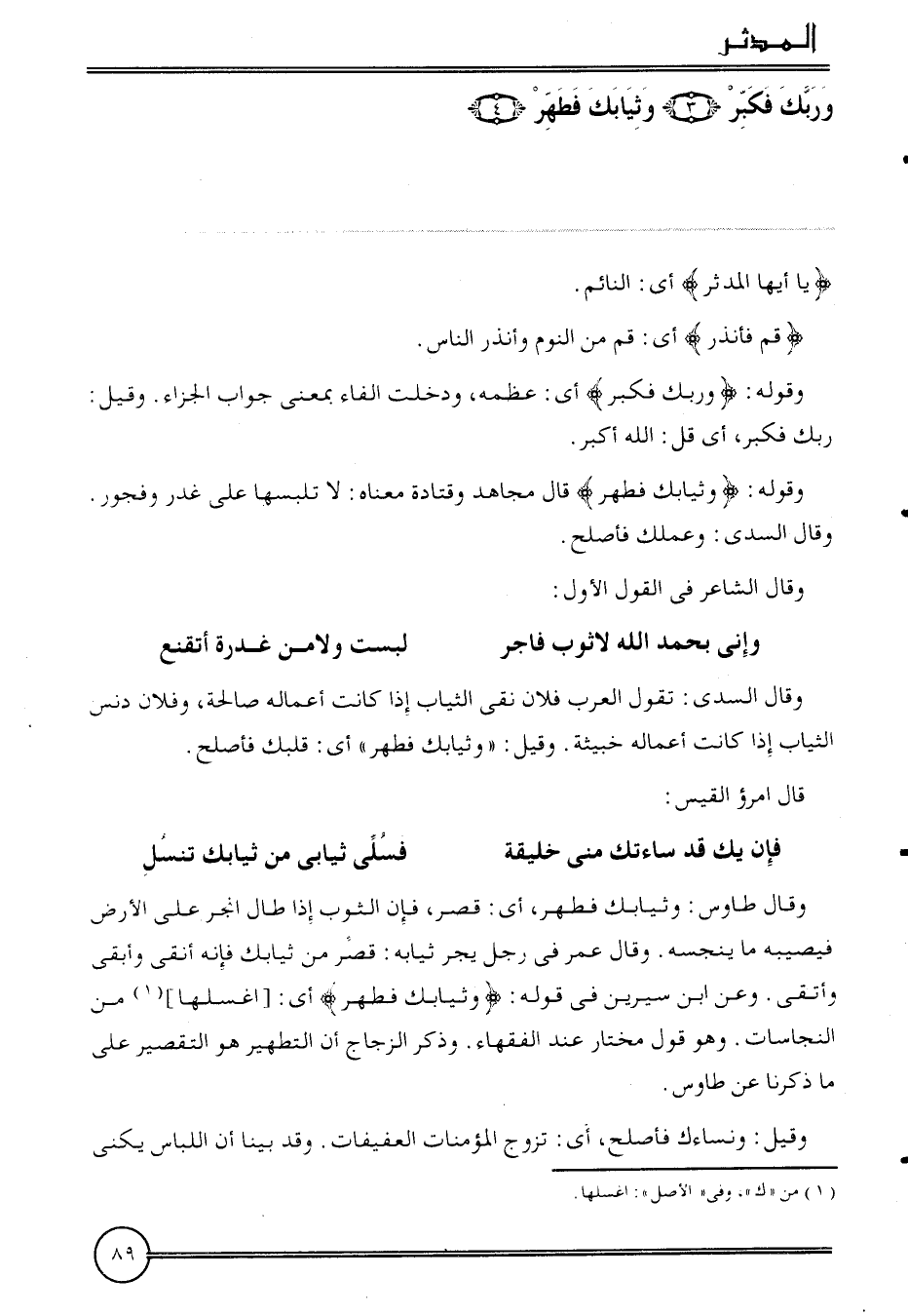 وَعَن ابْن سِيرِين فِي قَوْله: {وثيابك فطهر} أَي: [اغسلها] ، من النَّجَاسَات.