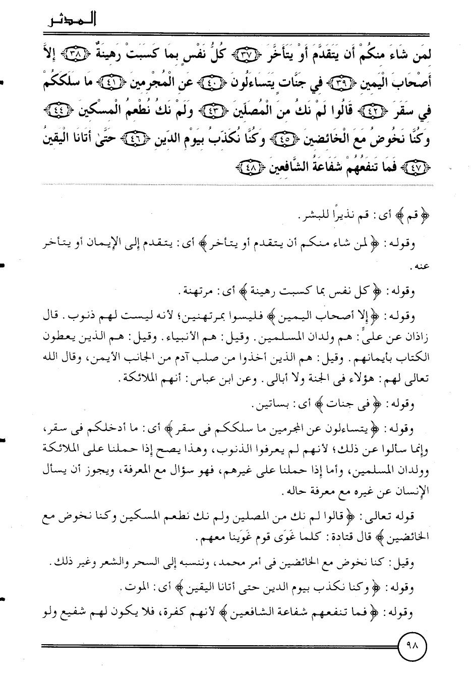 {لمن شَاءَ مِنْكُم أَن يتَقَدَّم أَو يتَأَخَّر (37) كل نفس بِمَا كسبت رهينة (38) إِلَّا أَصْحَاب الْيَمين (39) فِي جنَّات يتساءلون (40) عَن الْمُجْرمين (41) مَا سلككم فِي سقر (42) قَالُوا لم نك من الْمُصَلِّين (43) وَلم نك نطعم الْمِسْكِين (44) وَكُنَّا نَخُوض مَعَ الخائضين (45) وَكُنَّا نكذب بِيَوْم الدّين (46) حَتَّى أَتَانَا الْيَقِين (47) فَمَا تنفعهم شَفَاعَة الشافعين (48) } .