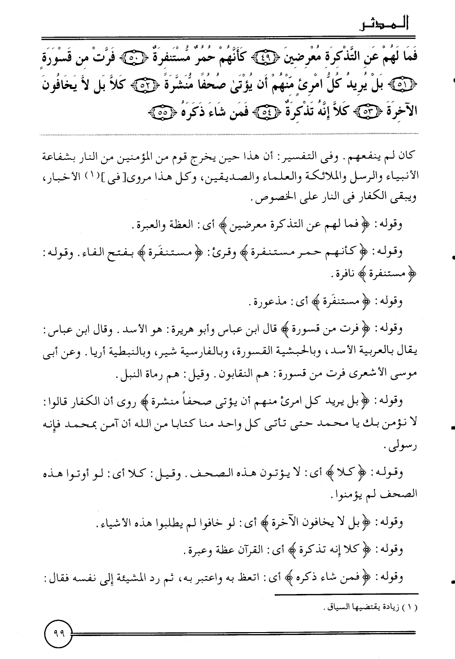 {فَمَا لَهُم عَن التَّذْكِرَة معرضين (49) كَأَنَّهُمْ حمر مستنفرة (50) فرت من قسورة (51) بل يُرِيد كل امْرِئ مِنْهُم أَن يُؤْتى صحفا منشرة (52) كلا بل لَا يخَافُونَ الْآخِرَة (53) كلا إِنَّه تذكرة (54) فَمن شَاءَ ذكره (55) } . كَانَ لم يَنْفَعهُمْ.
