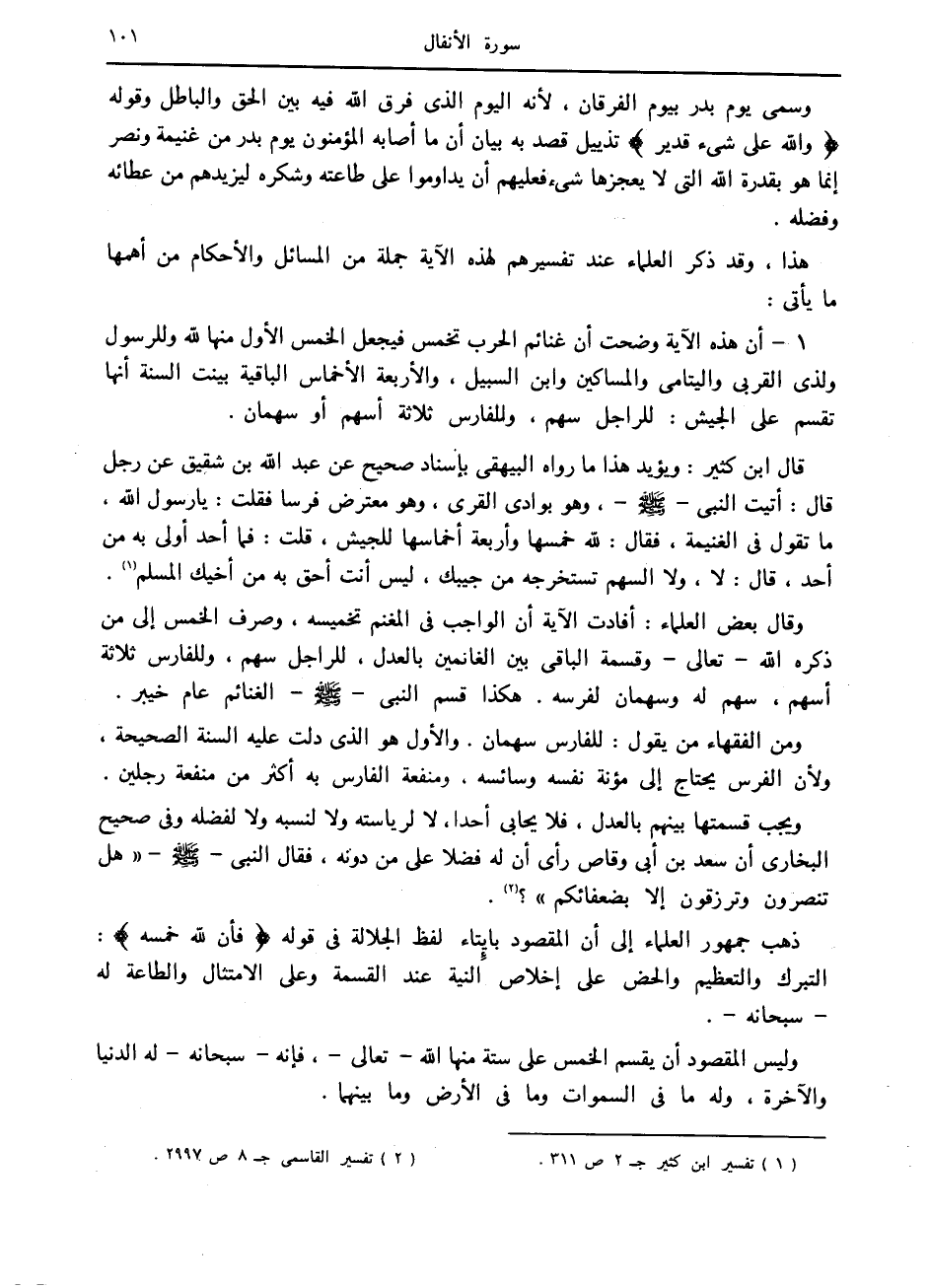 قال ابن كثير: ويؤيد هذا ما رواه البيهقي بإسناد صحيح عن عبد الله بن شقيق عن رجل قال: أتيت النبي صلى الله عليه وسلم، وهو بوادي القرى، وهو معترض فرسا فقلت: يا رسول الله، ما تقول في الغنيمة، فقال: لله خمسها وأربعة أخماسها للجيش، قلت: فما أحد أولى به من أحد، قال: لا، ولا السهم تستخرجه من جيبك، ليس أنت أحق به من أخيك المسلم «1» .