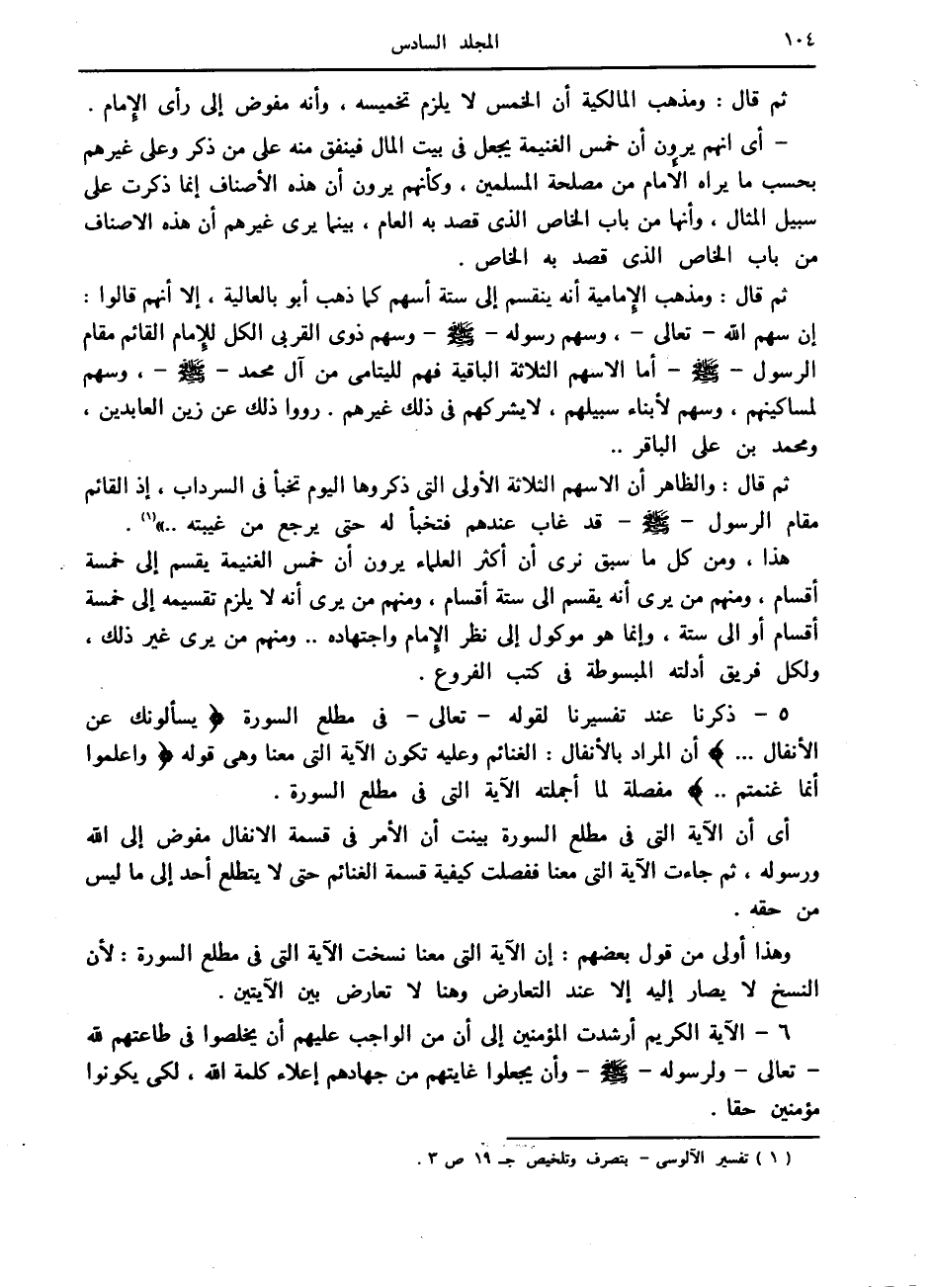 هذا، ومن كل ما سبق نرى أن أكثر العلماء يرون أن خمس الغنيمة يقسم إلى خمسة أقسام، ومنهم من يرى أنه يقسم الى ستة أقسام، ومنهم من يرى أنه لا يلزم تقسيمه إلى خمسة أقسام أو إلى ستة، وإنما هو موكول إلى نظر الإمام واجتهاده.. ومنهم من يرى غير ذلك، ولكل فريق أدلته المبسوطة في كتب الفروع.