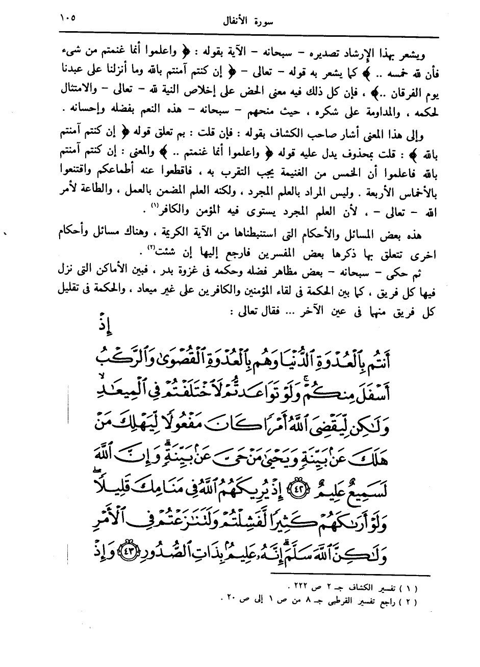 ثم حكى- سبحانه- بعض مظاهر فضله وحكمه في غزوة بدر، فبين الأماكن التي نزل فيها كل فريق، كما بين الحكمة في لقاء المؤمنين والكافرين على غير ميعاد، والحكمة في تقليل كل فريق منهما في عين الآخر ... فقال تعالى:
