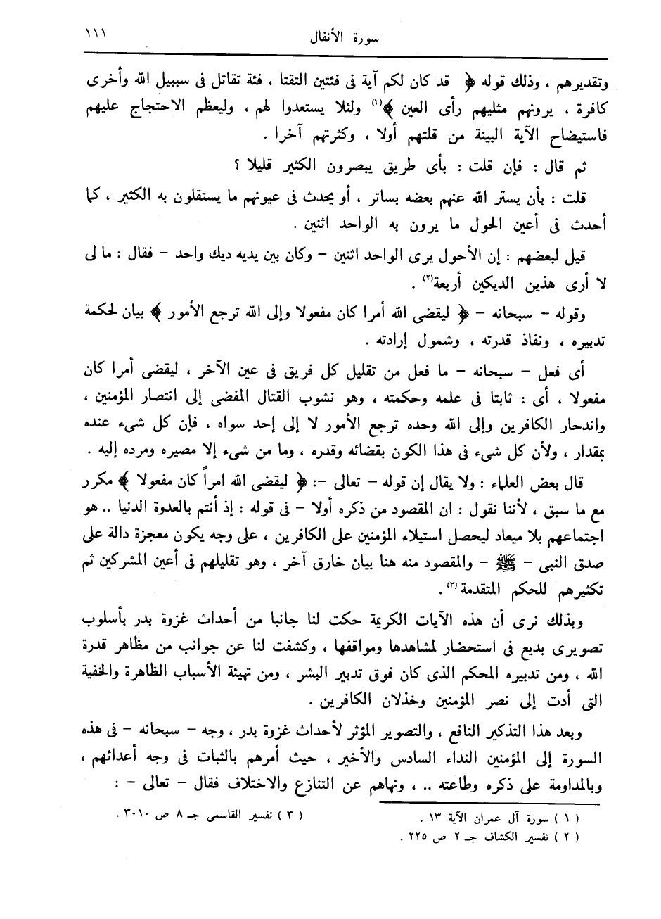قال بعض العلماء: ولا يقال إن قوله- تعالى-: لِيَقْضِيَ اللَّهُ أَمْراً كانَ مَفْعُولًا مكرر مع ما سبق، لأننا نقول: إن المقصود من ذكره أولا- في قوله: إذ أنتم بالعدوة الدنيا.. هو اجتماعهم بلا ميعاد ليحصل استيلاء المؤمنين على الكافرين، على وجه يكون معجزة دالة على صدق النبي صلى الله عليه وسلم والمقصود منه هنا بيان خارق آخر، وهو تقليلهم في أعين المشركين ثم تكثيرهم للحكم المتقدمة «3» .