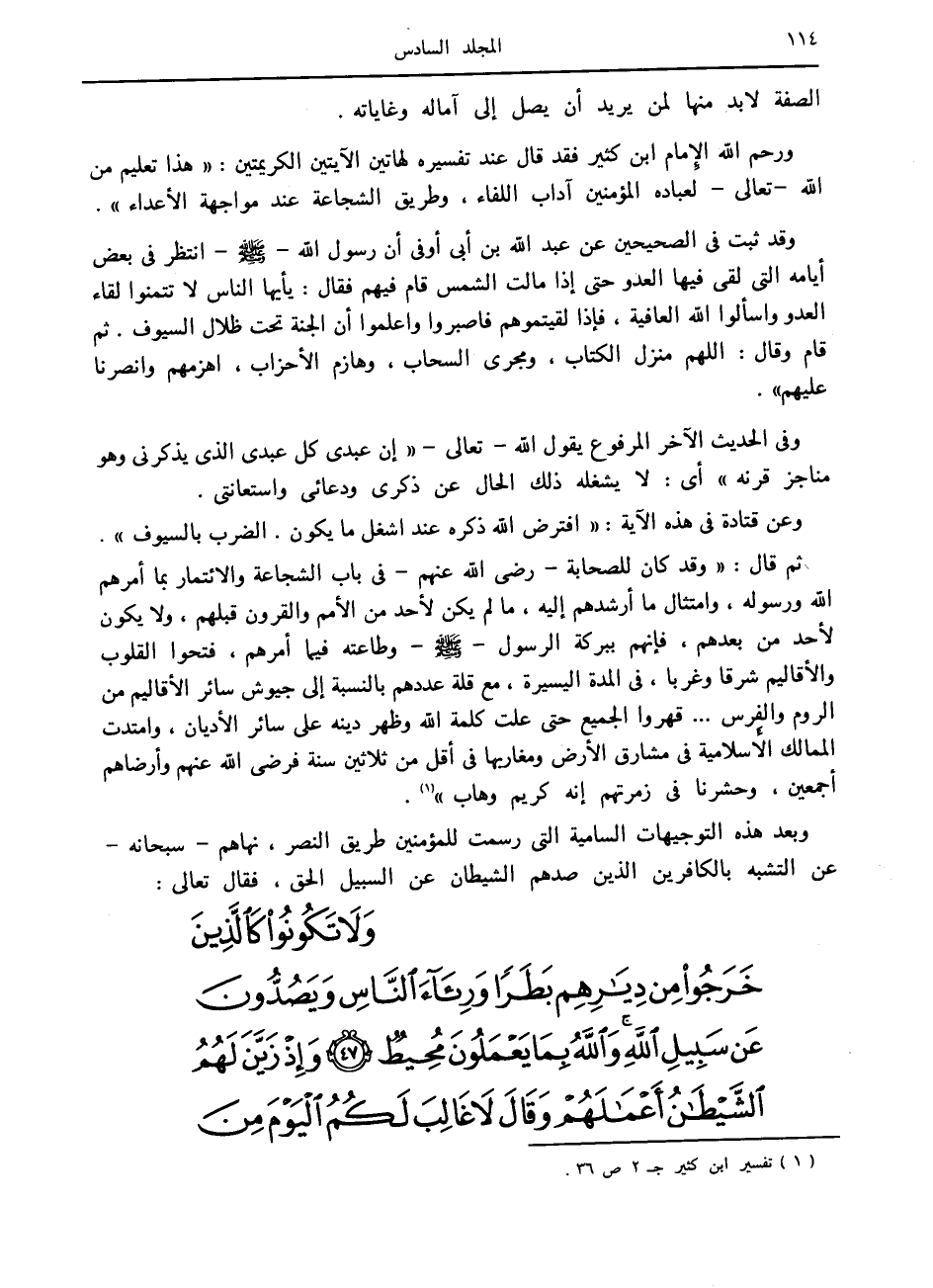 ورحم الله الإمام ابن كثير فقد قال عند تفسيره لهاتين الآيتين الكريمتين: «هذا تعليم من الله- تعالى- لعباده المؤمنين آداب اللقاء، وطريق الشجاعة عند مواجهة الأعداء» .